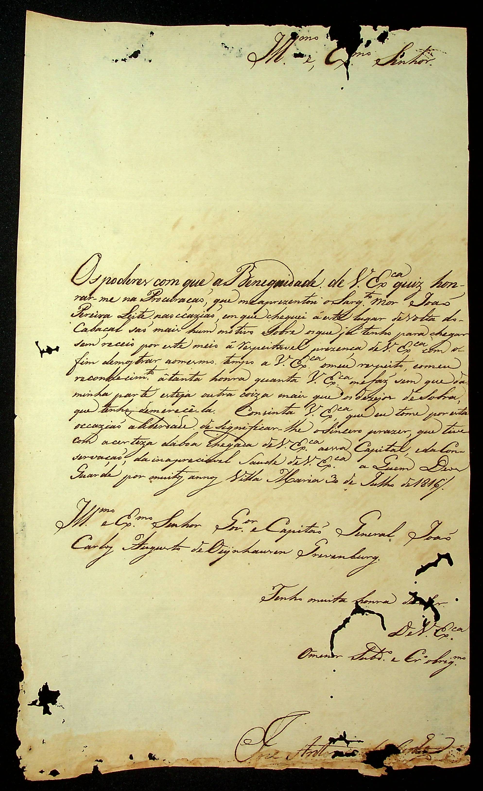 CARTA de José Antônio [...] ao Governador e Capitão General da Capitania de Mato Grosso João Carlos Augusto de Oeynhausen e Gravemberg.