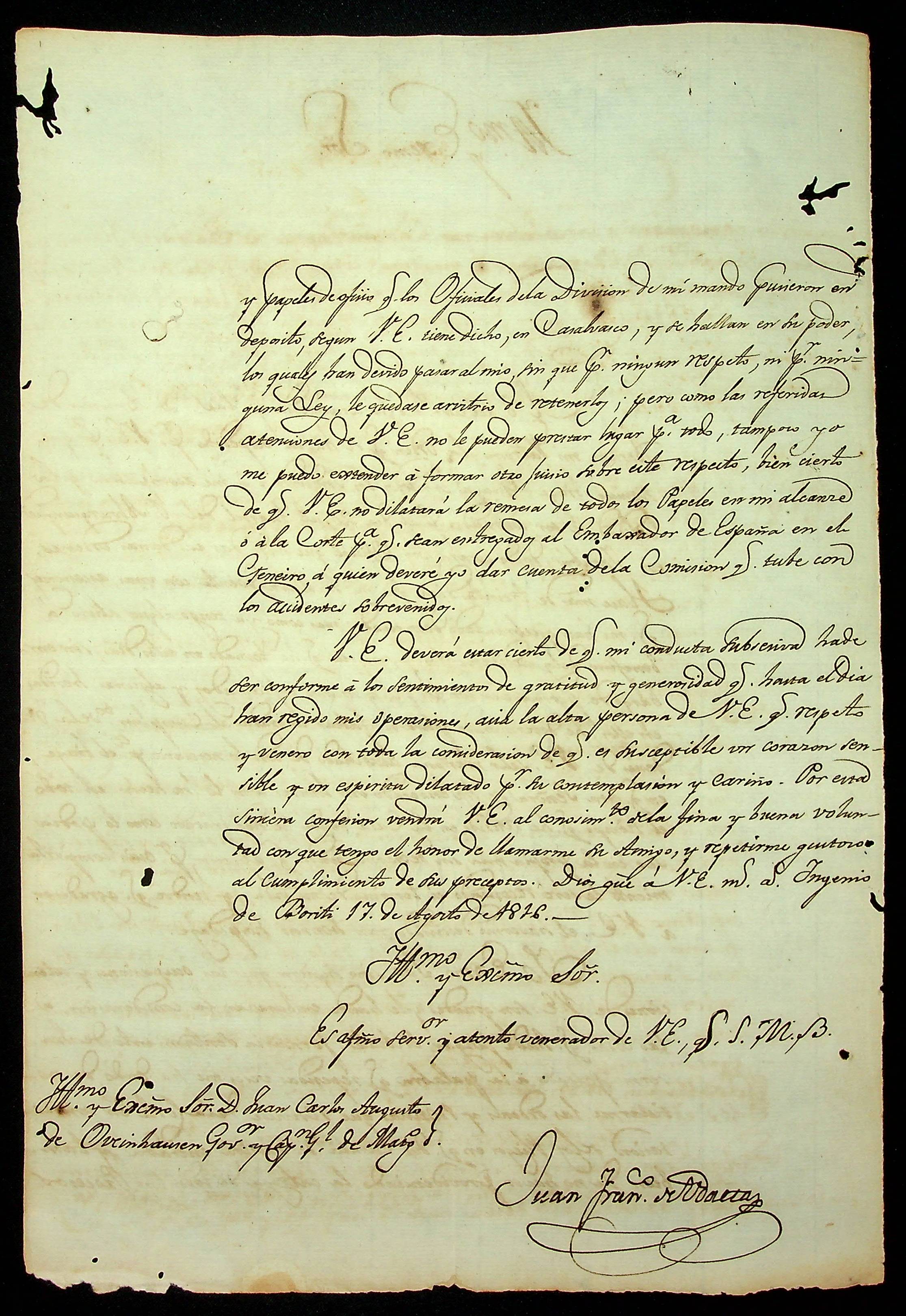 CARTA de Juan Francisco [...] ao Governador e Capitão General da Capitania de Mato Grosso João Carlos Augusto de Oeynhausen e Gravemberg.