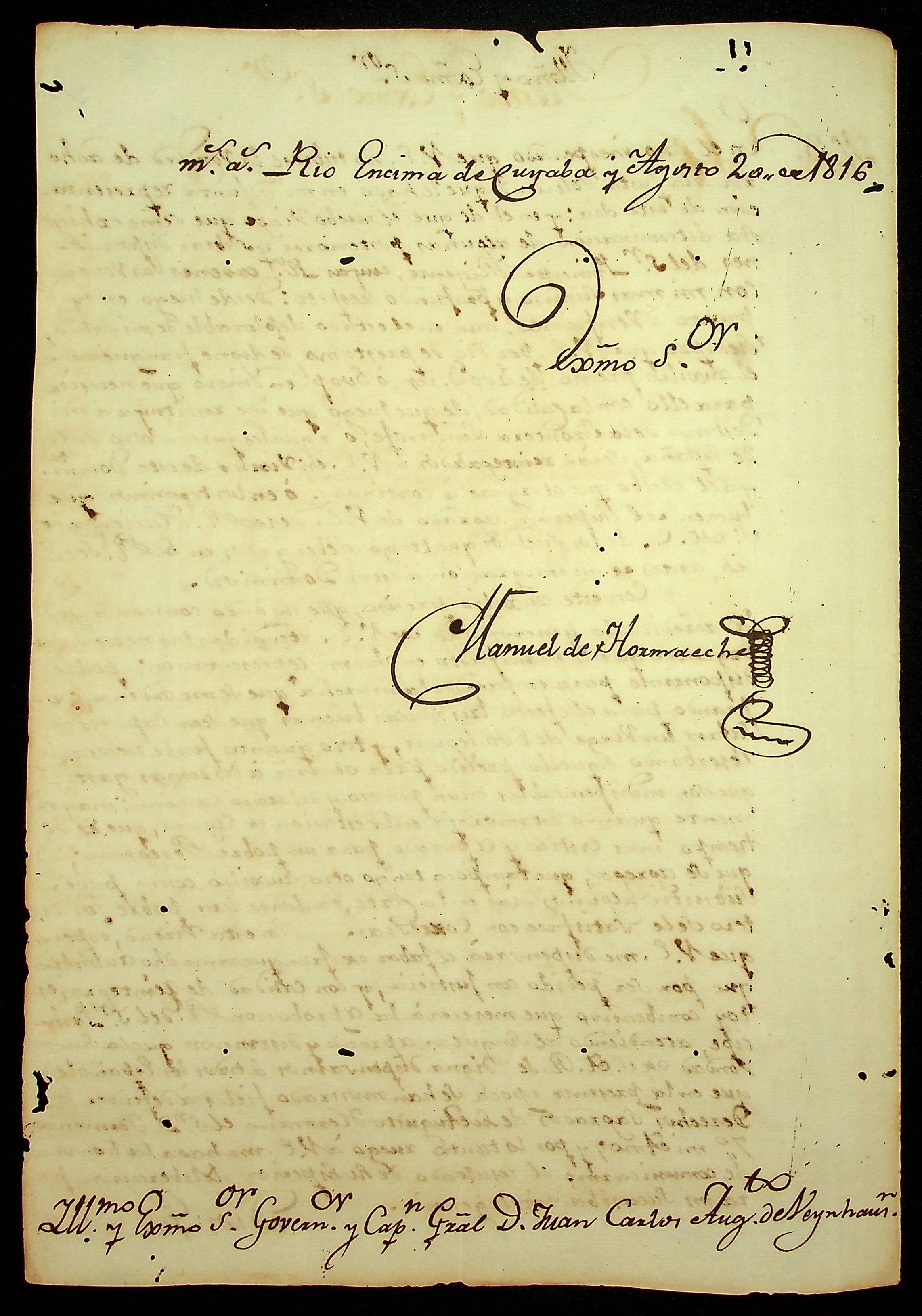 CARTA de Manoel de Hormache ao [Governador e Capitão-General da Capitania de Mato Grosso] João Carlos Augusto D’Oeynhausen e Gravemberg.