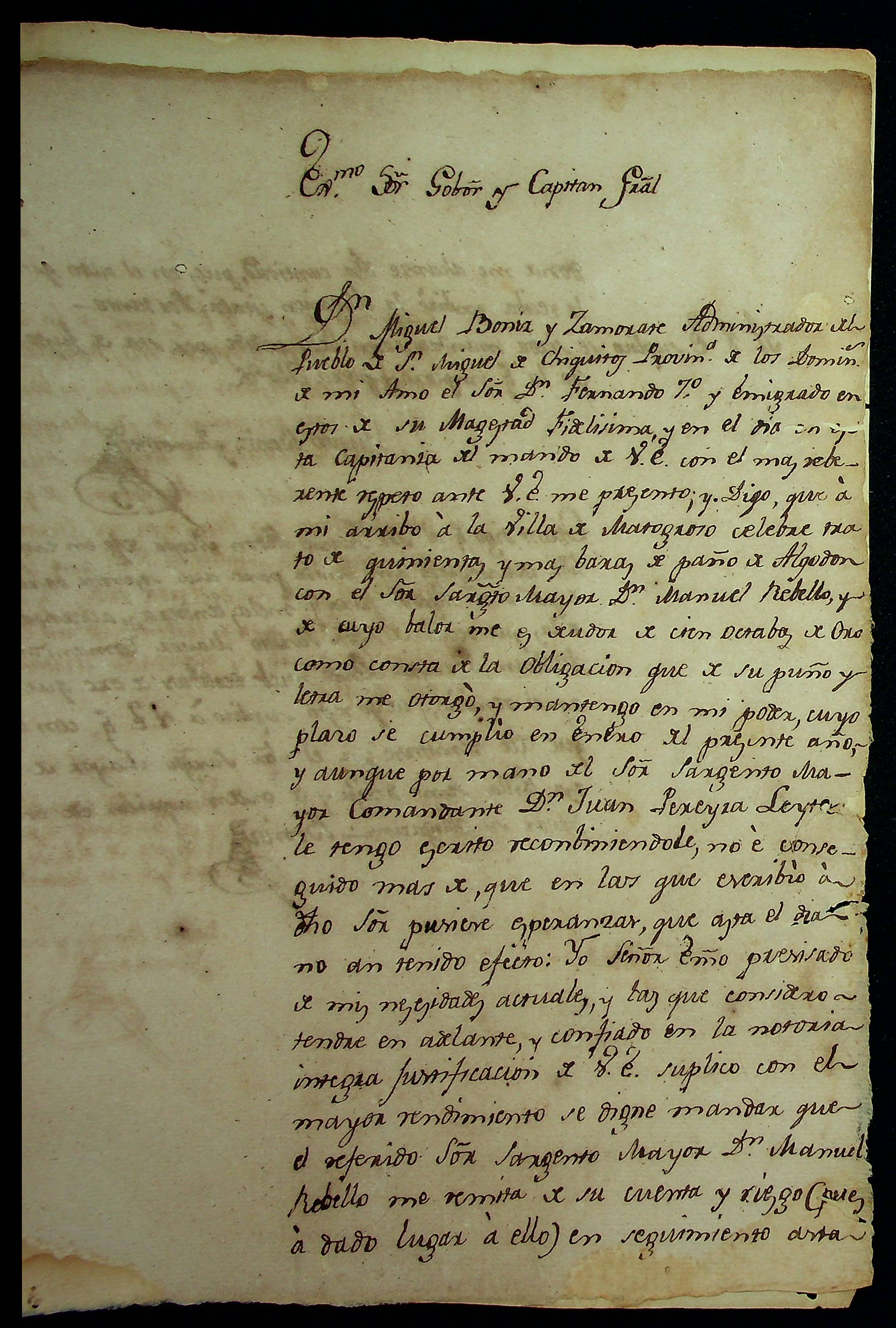 CARTA de Miguel Boris Zamorate ao [Governador e Capitão-General da Capitania de Mato Grosso João Carlos Augusto D´Oeynhausen e Gravemberg].