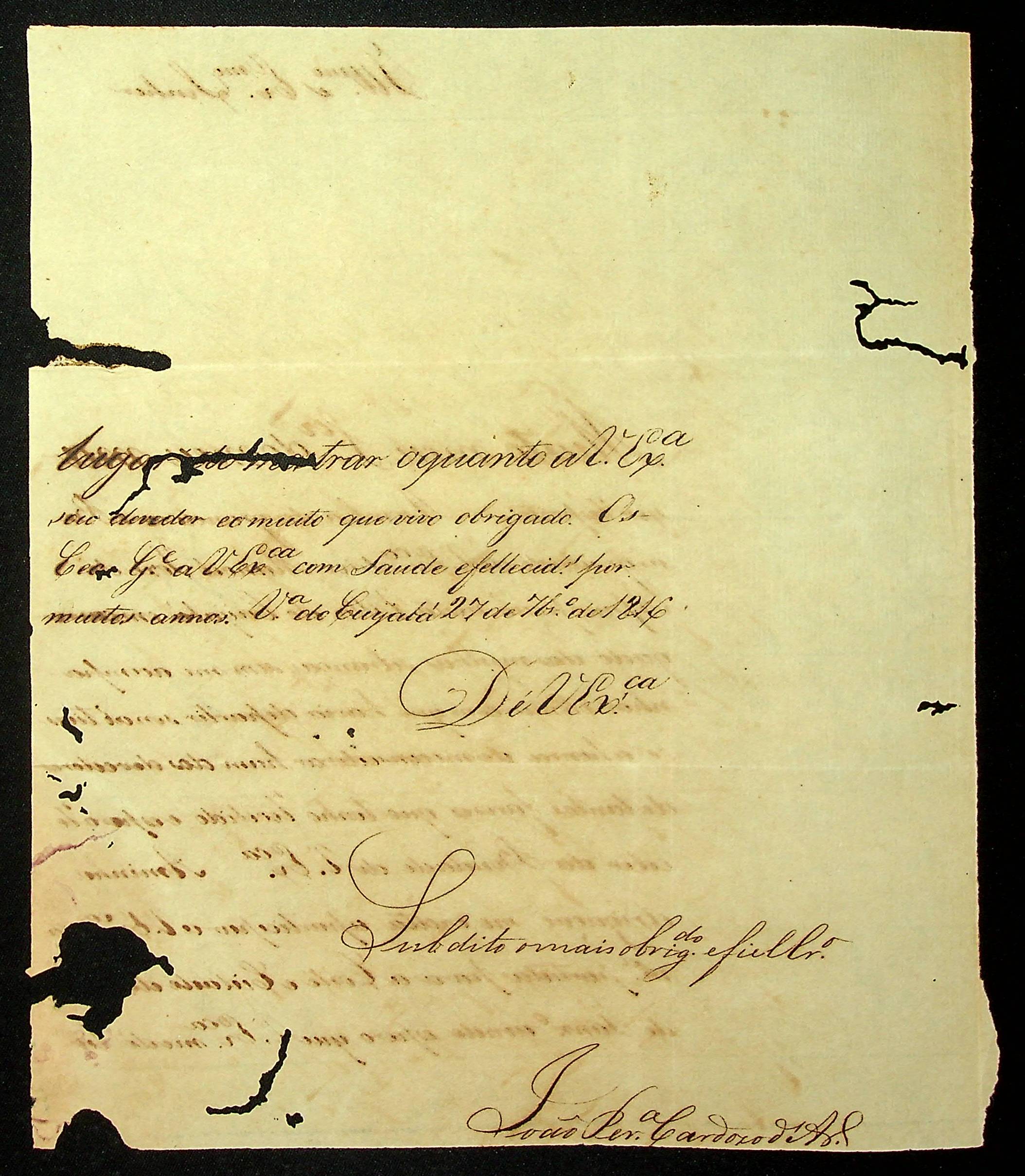 CARTA de João Pereira Cardoso de Araújo ao [Governador e Capitão-General da Capitania de Mato Grosso João Carlos Augusto D´Oeynhausen e Gravemberg].