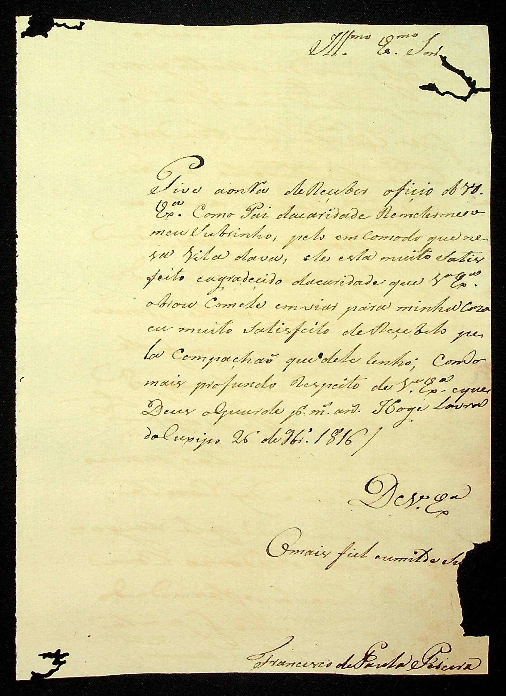 CARTA de Francisco de Paula Pereira ao [Governador e Capitão-General da Capitania de Mato Grosso João Carlos Augusto D´Oeynhausen e Gravemberg].