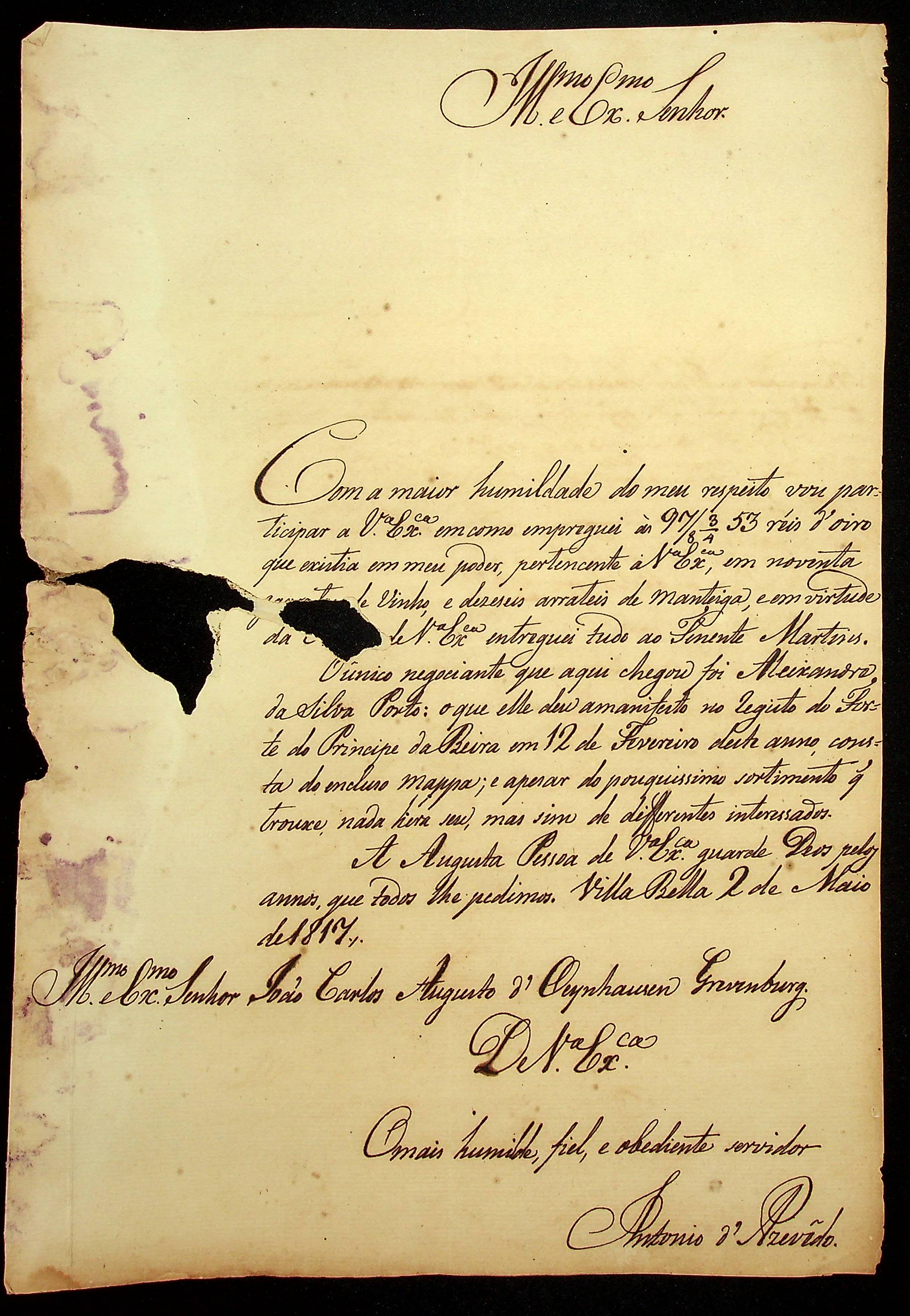 CARTA de Antônio Azevedo ao [Governador e Capitão-General da Capitania de Mato Grosso] João Carlos Augusto D’Oeynhausen e Gravemberg.