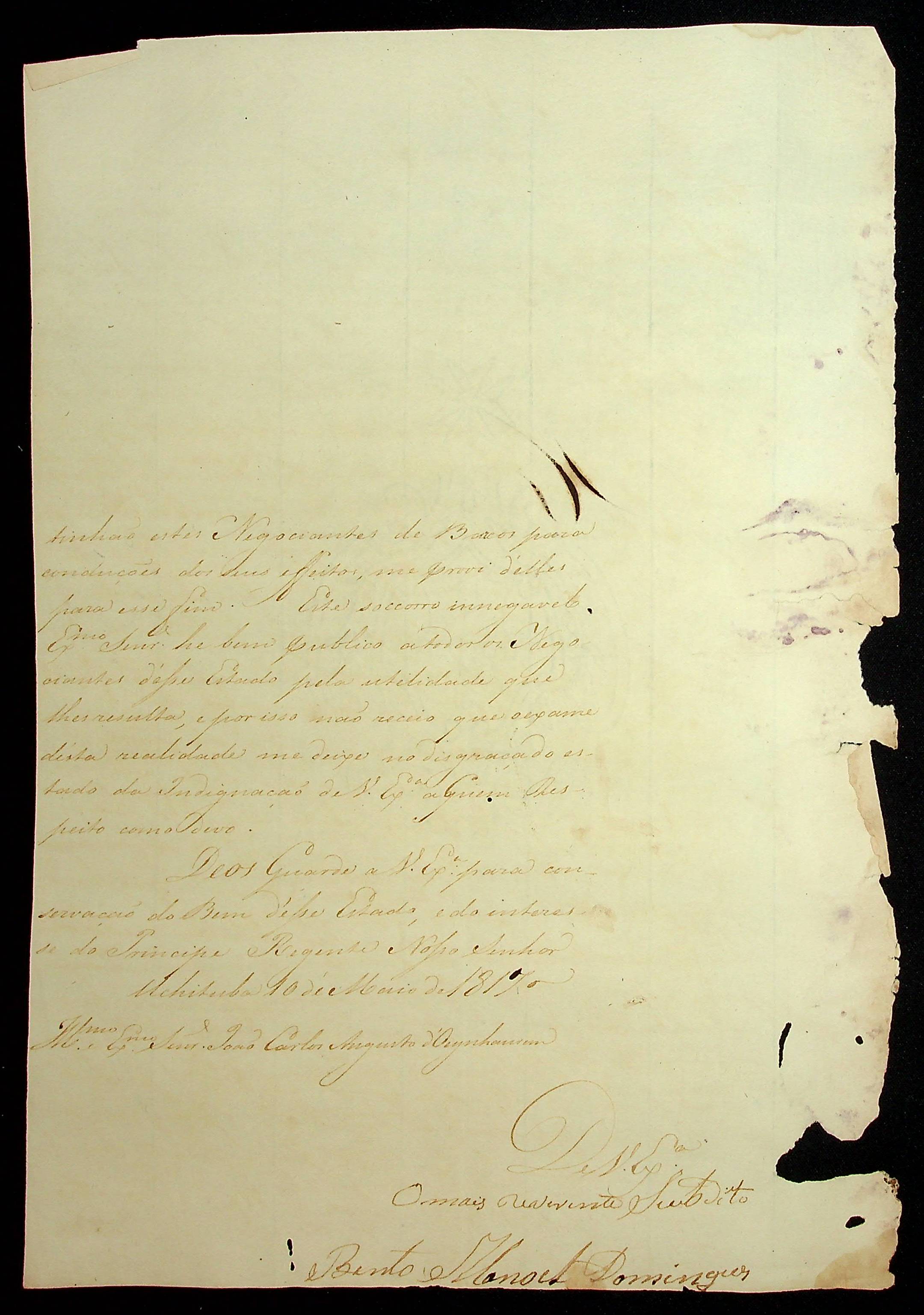 CARTA de Bento Manoel Domingos ao [Governador e Capitão-General da Capitania de Mato Grosso] João Carlos Augusto D’Oeynhausen e Gravemberg.