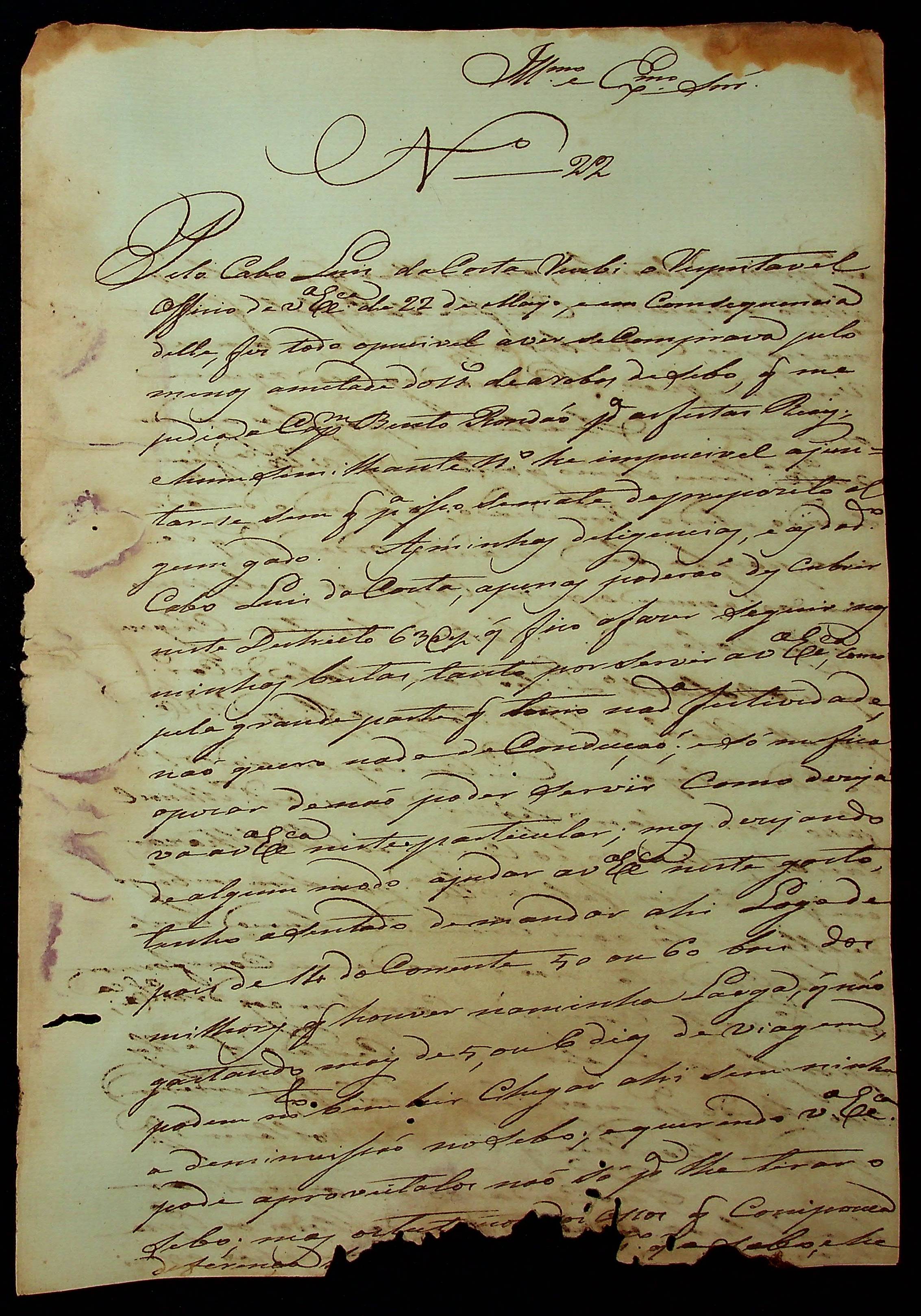 CARTA de João Pereira Leite ao [Governador e Capitão-General da Capitania de Mato Grosso] João Carlos Augusto D’Oeynhausen e Gravemberg.