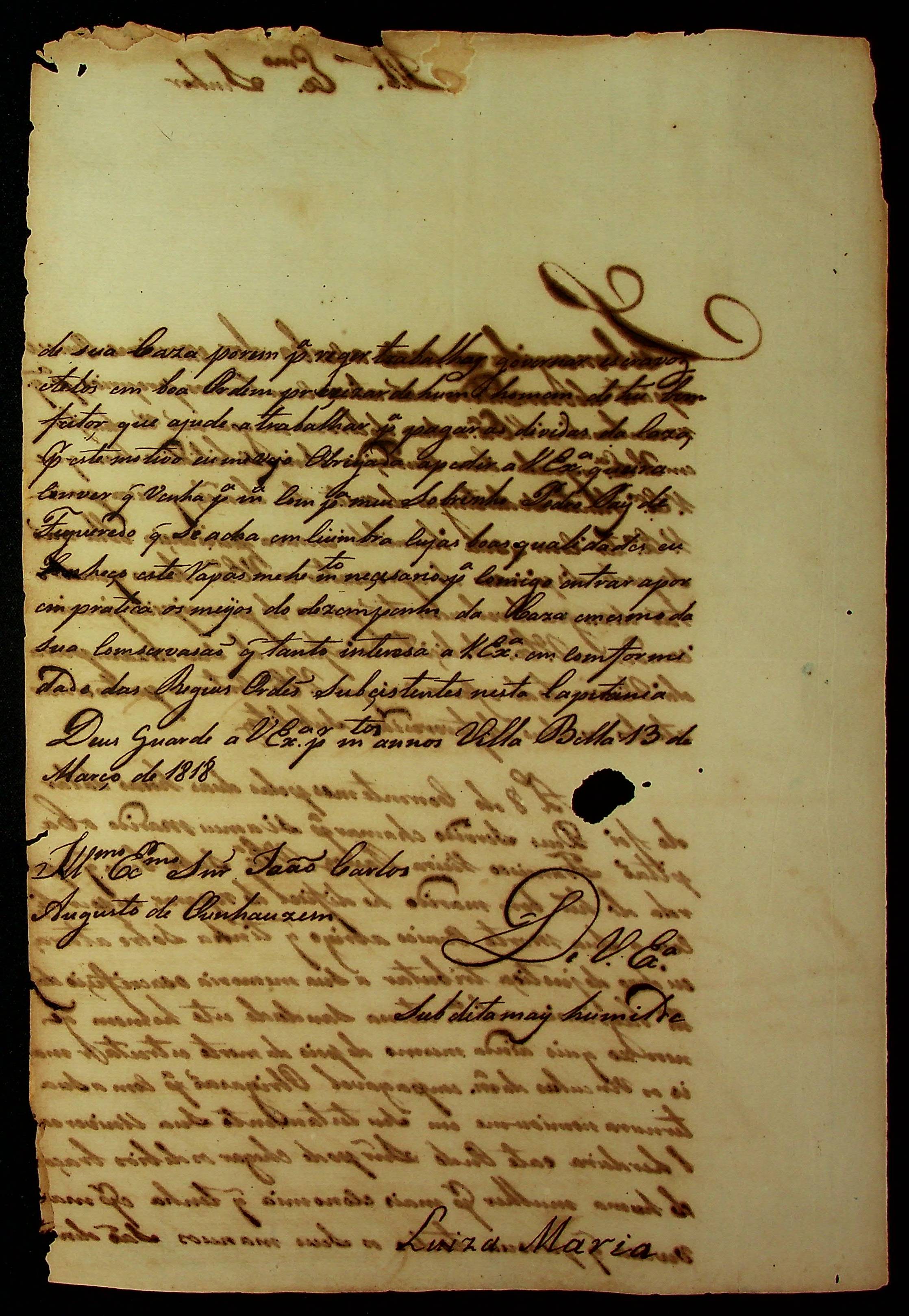 CARTA de Luiza Maria ao [Governador e Capitão-General da Capitania de Mato Grosso] João Carlos Augusto D’ Oeynhausen e Gravemberg.
