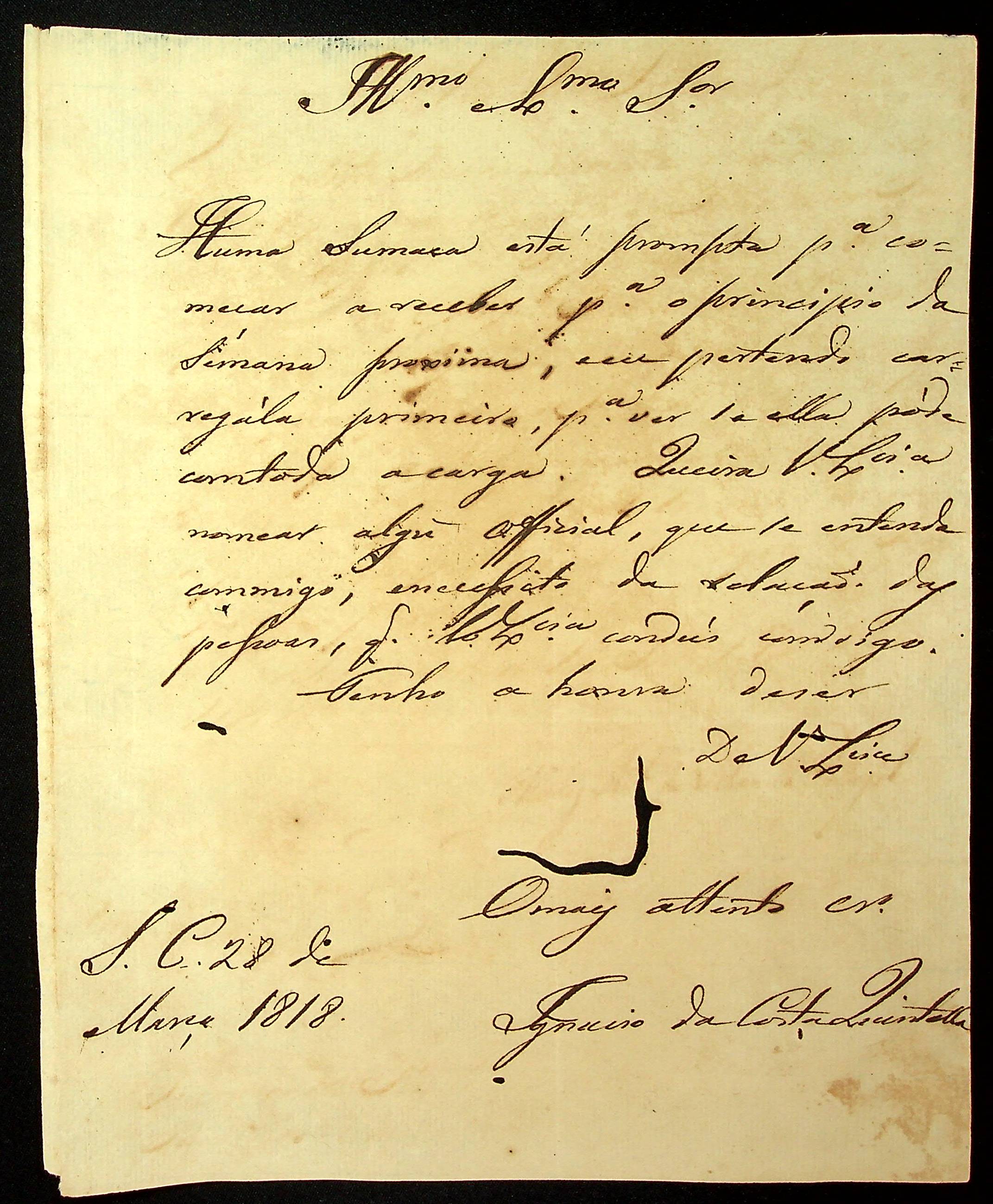 CARTA de Ignácio da Costa [Quintalha] ao [Governador e Capitão-General da Capitania de Mato Grosso João Carlos Augusto D´Oeynhausen e Gravemberg].