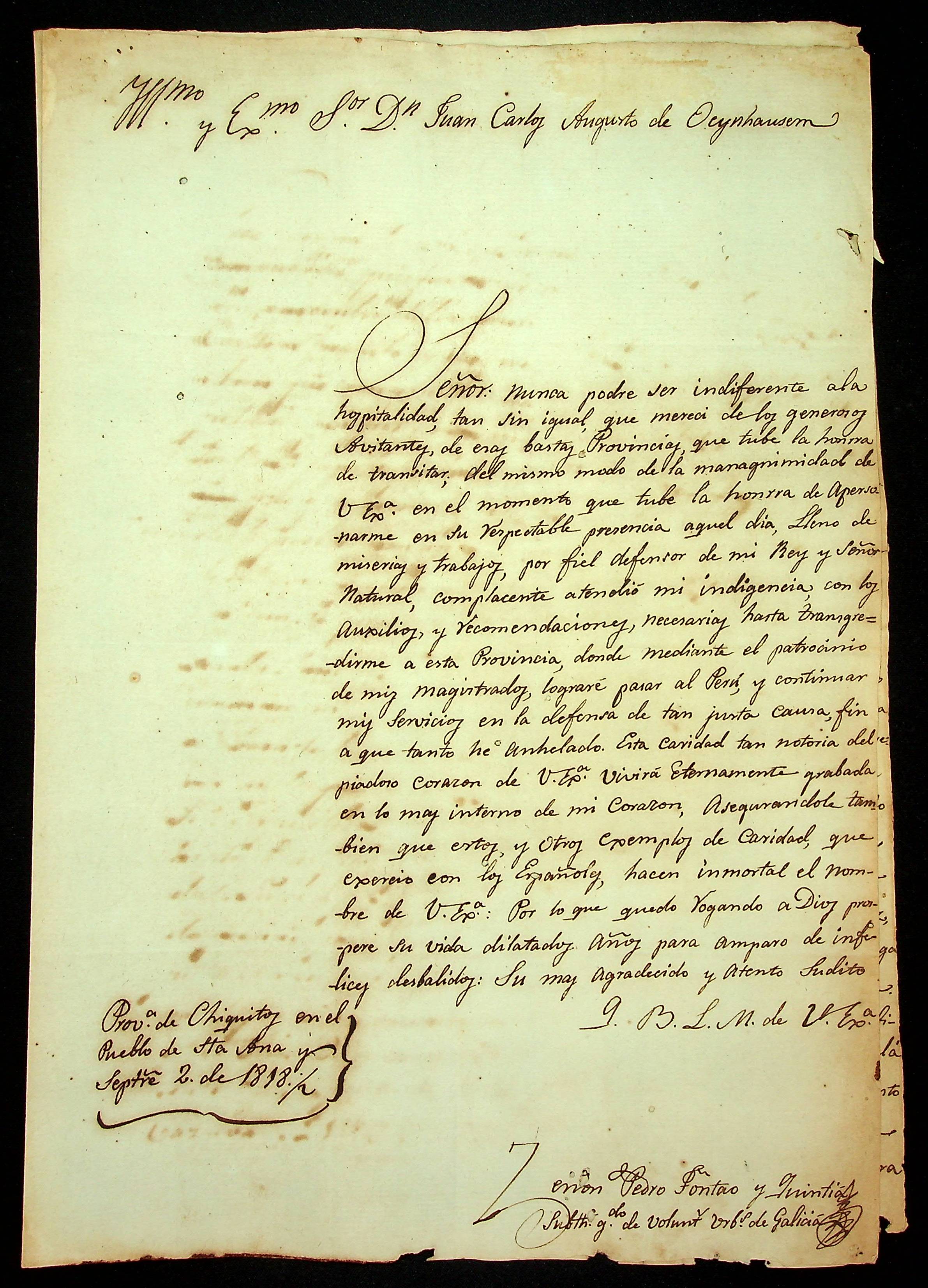 CARTA de Zenon Pedro Fontao y [Quintia] ao [Governador e Capitão-General da Capitania de Mato Grosso] João Carlos Augusto D’Oeynhausen e Gravemberg.