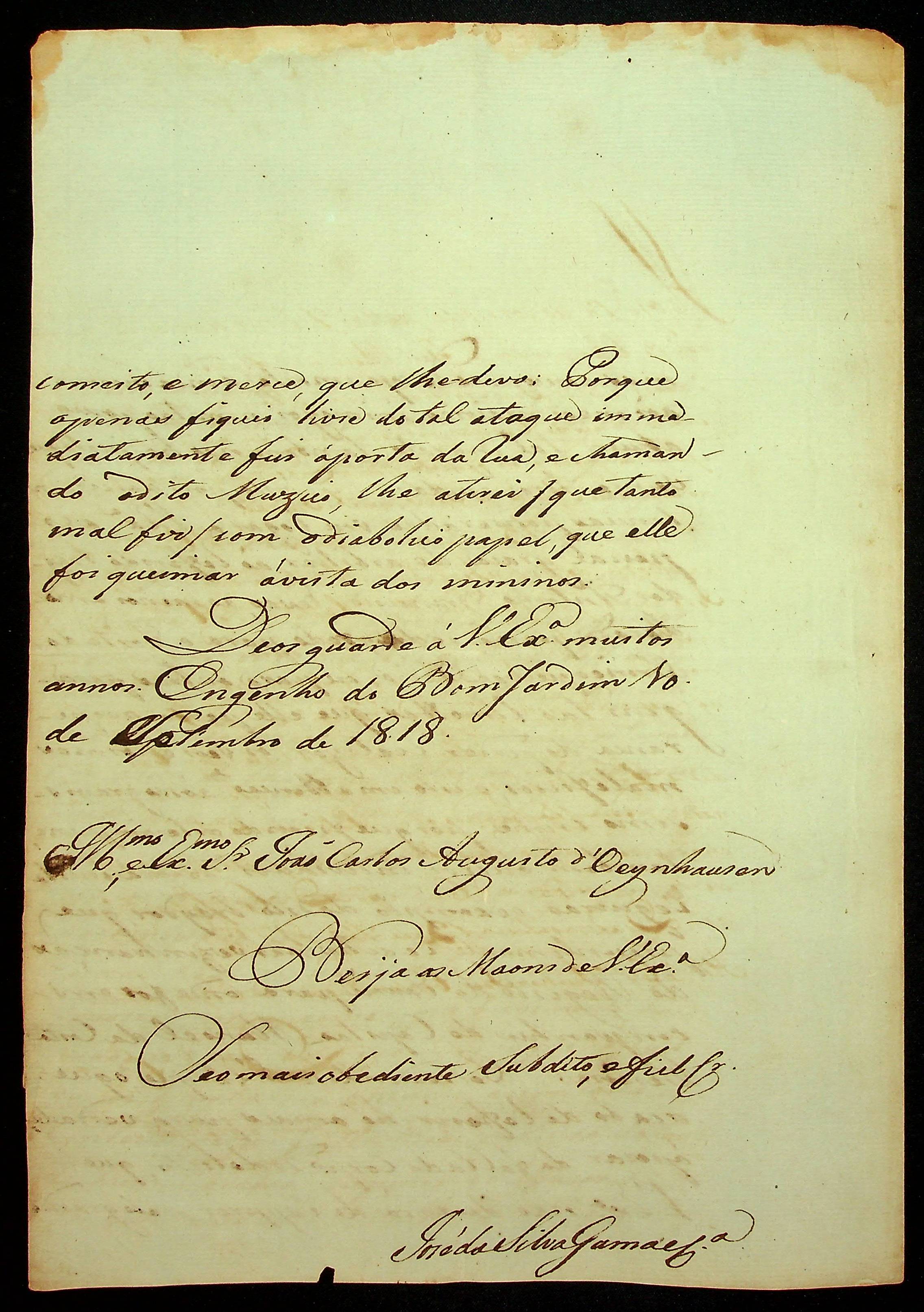 CARTA de José da Silva Gama ao [Governador e Capitão-General da Capitania de Mato Grosso] João Carlos Augusto D’Oeynhausen e Gravemberg.