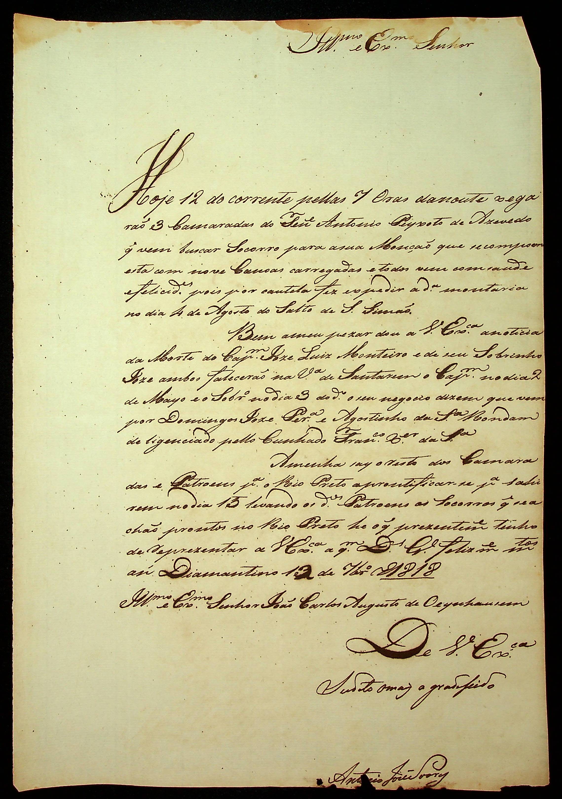 CARTA de Antônio José Soares ao [Governador e Capitão-General da Capitania de Mato Grosso] João Carlos Augusto D’Oeynhausen e Gravemberg.