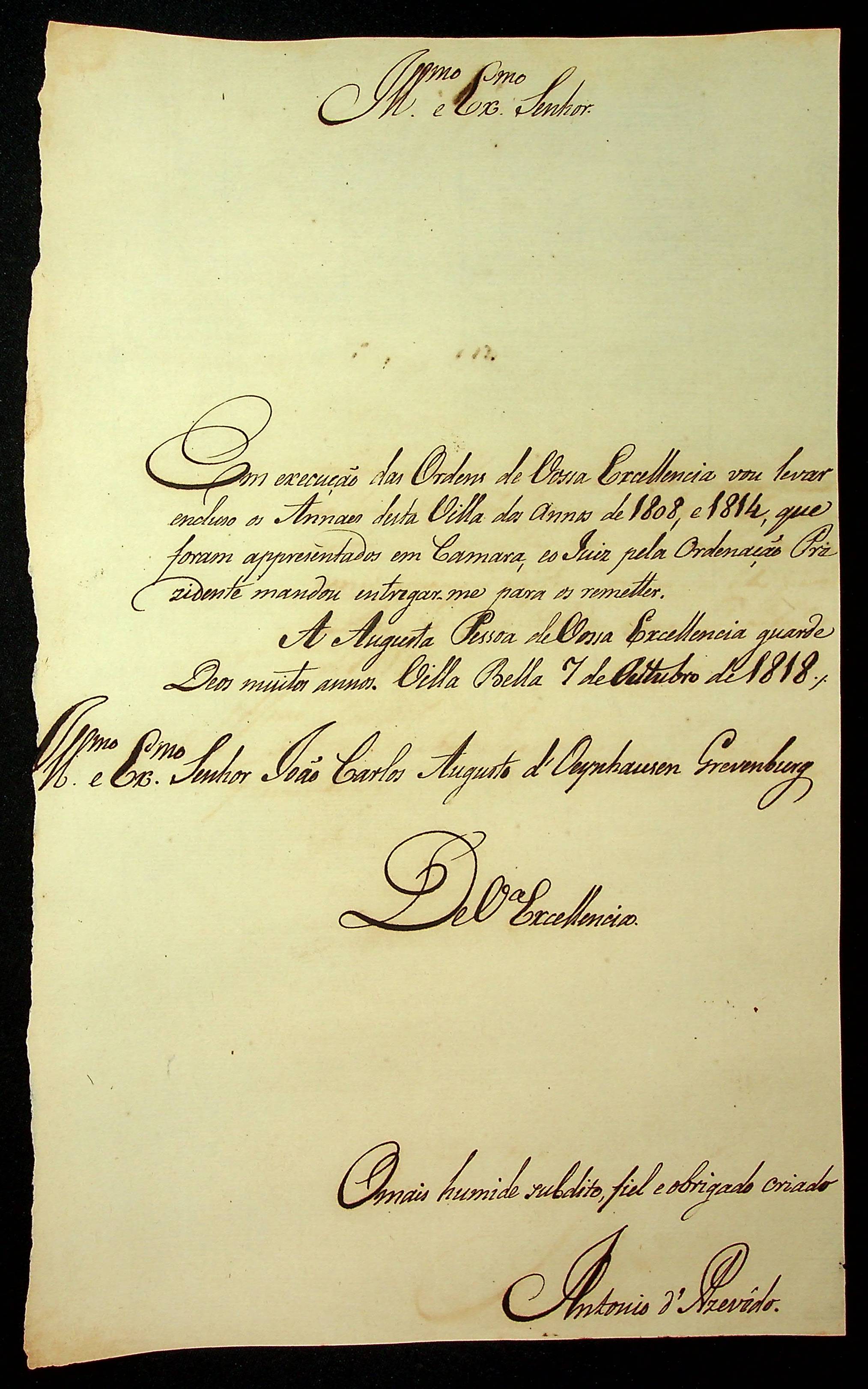 CARTA de Antônio de Azevedo ao [Governador e Capitão-General da Capitania de Mato Grosso] João Carlos Augusto D’Oeynhausen e Gravemberg