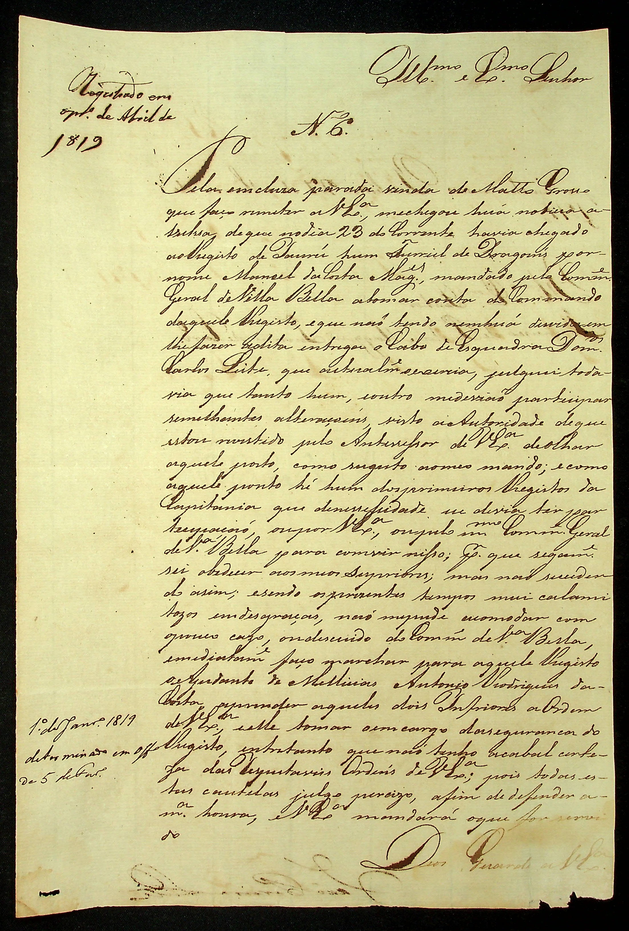 CARTA de João Pereira Leite ao [Governador e Capitão General da Capitania de Mato Grosso] Francisco de Paula Magessi Tavares de Carvalho.