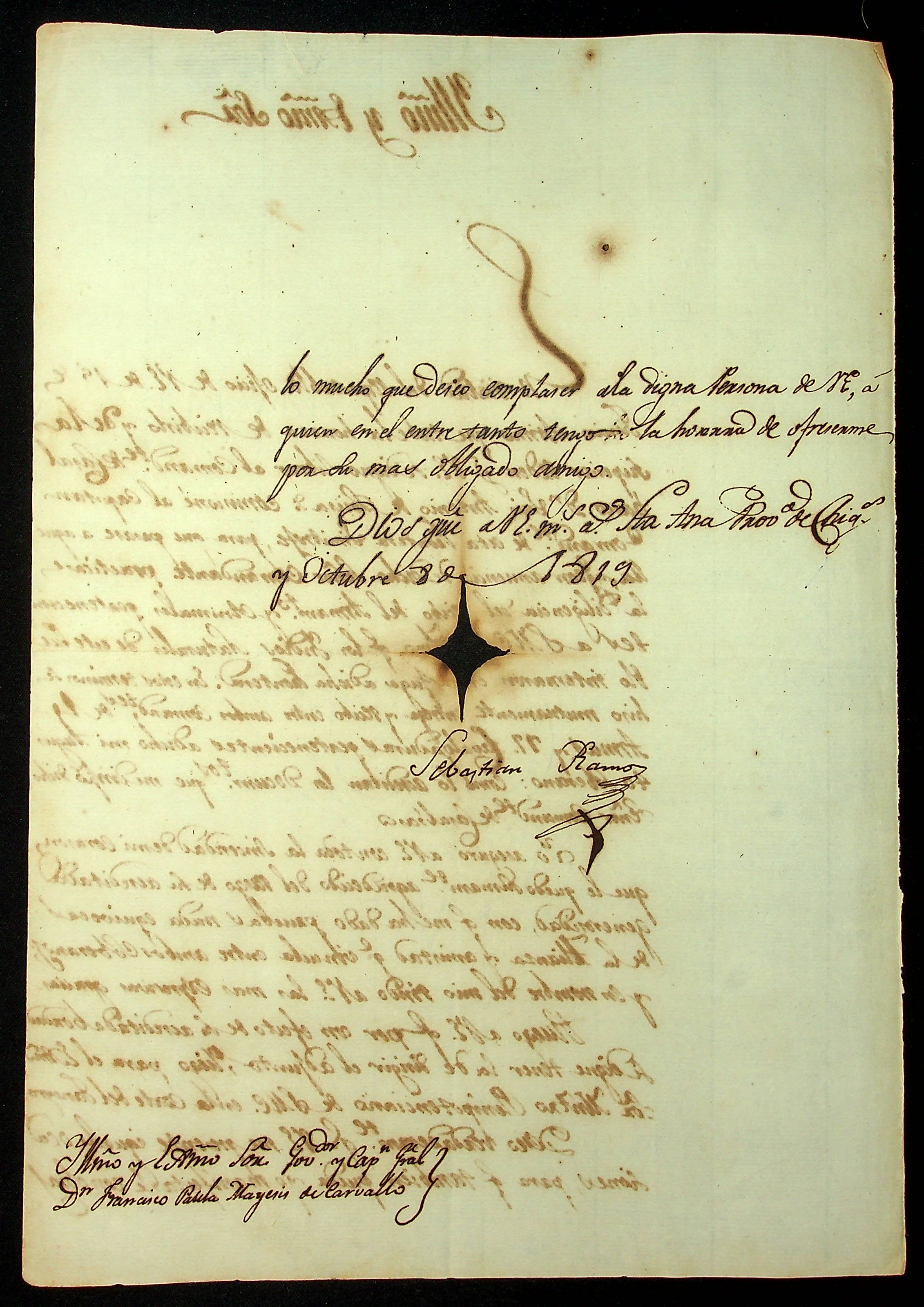 CARTA de Sebastian Ramos ao Governador e Capitão General da Capitania de Mato Grosso Francisco de Paula Maggessi Tavares de Carvalho.