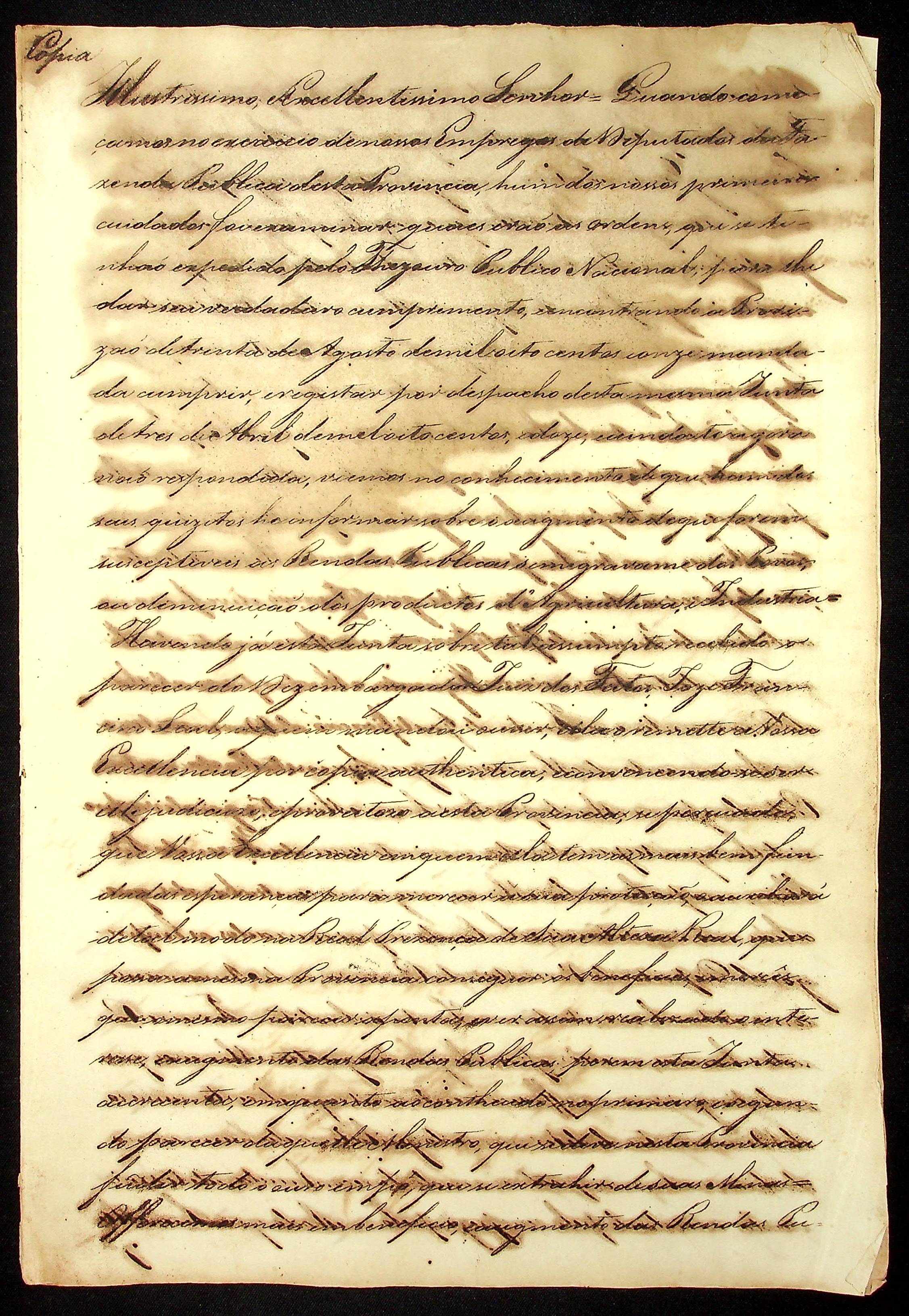 CARTA (cópia) da [Junta de Gratificação de Diamantes e Melhoramento da Mineração] ao Ministro e Secretário de Estado de Negócios da Fazenda e Presidente do Tesouro Publico Caetano Pinto de Miranda Montenegro.