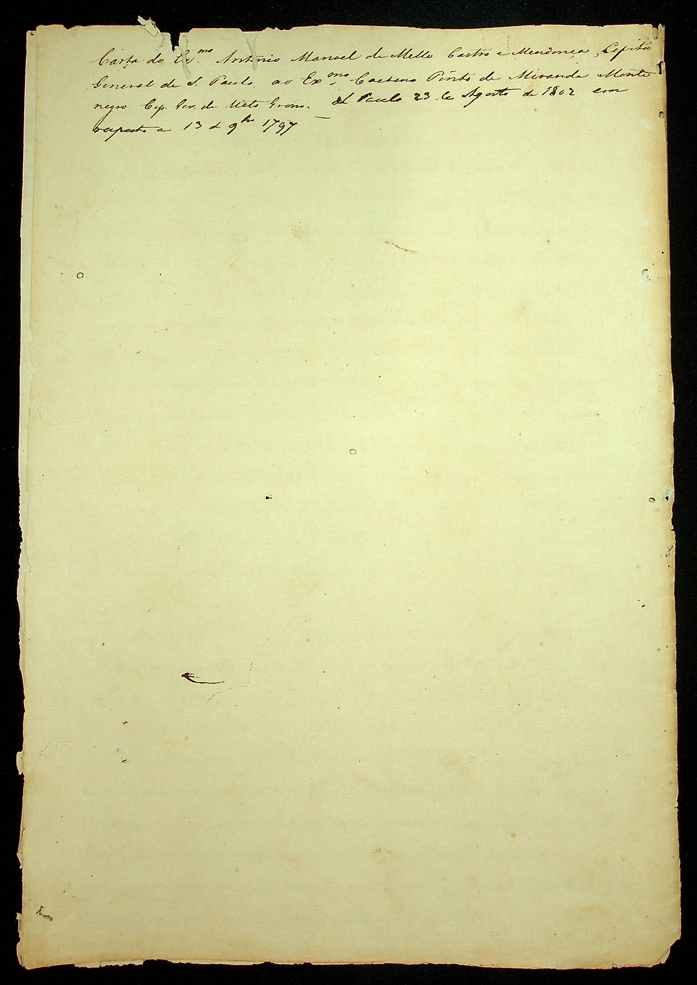 CARTA do [Governador e Capitão General da Capitania de São Paulo] Antônio Manoel de Melo Castro e Mendonça para o Governador e Capitão General da Capitania de Mato Grosso Caetano Pinto de Miranda e Montenegro.