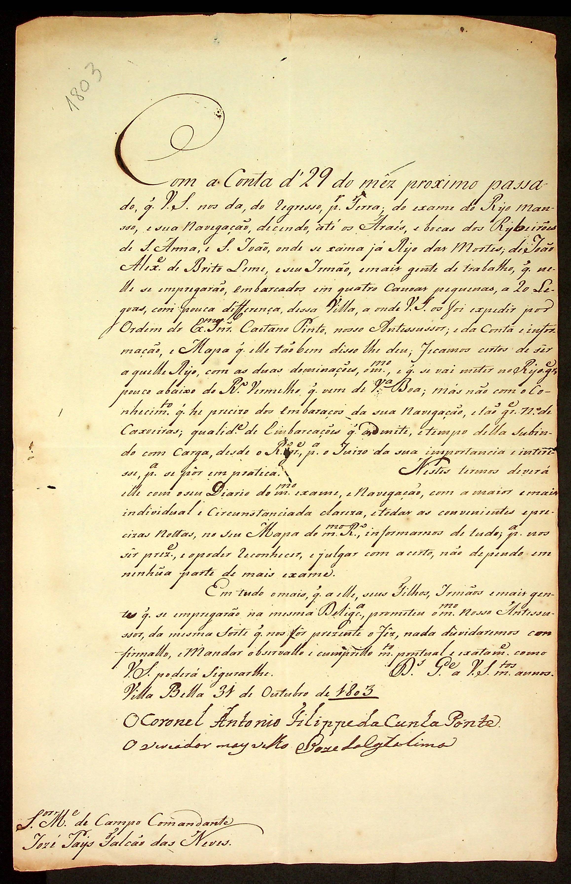 CARTA da [Segunda Junta Governativa da Capitania de Mato Grosso] ao Mestre de Campo Comandante José Paes Falcão das Neves.