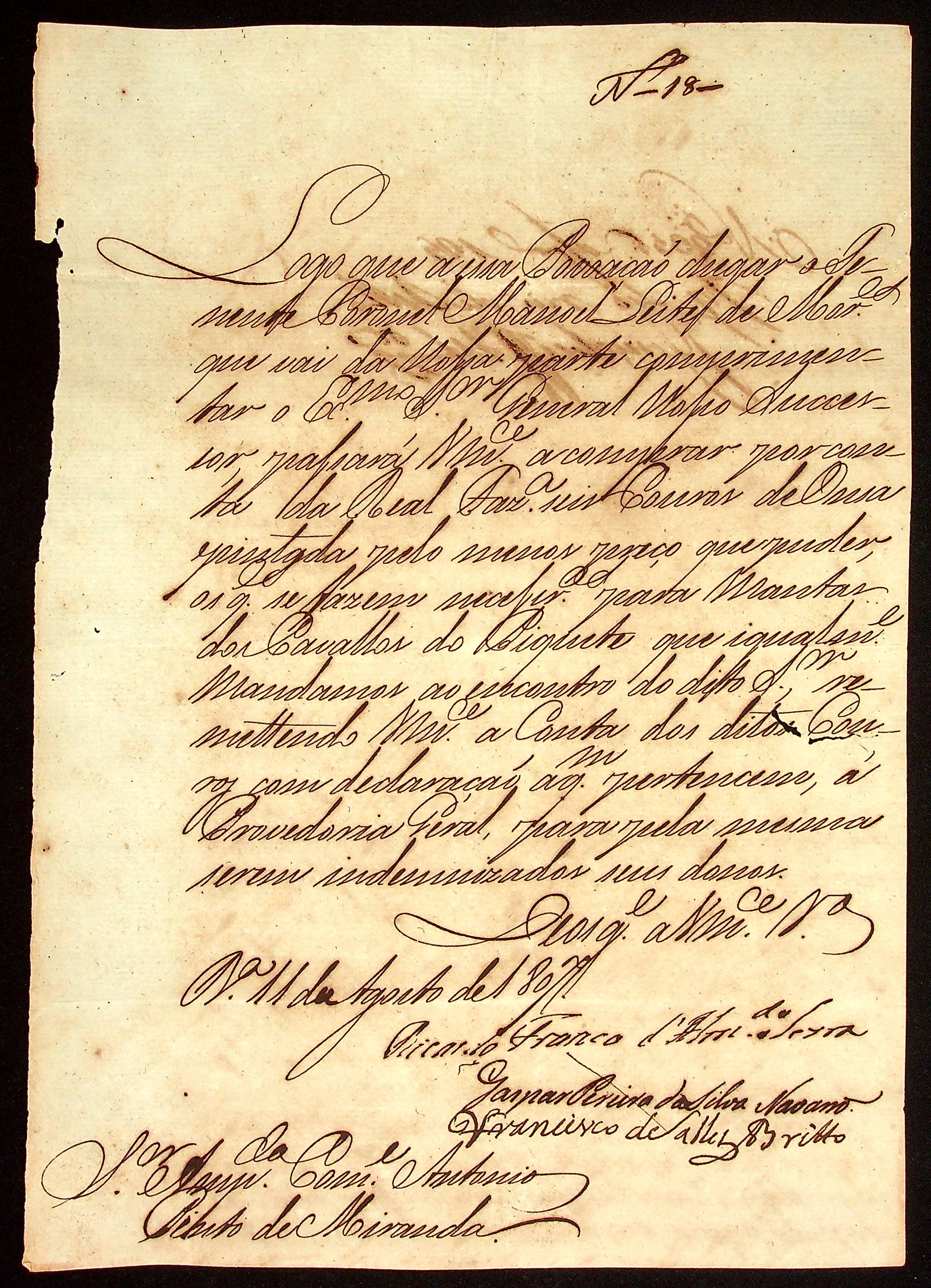 CARTA da [Terceira Junta Governativa da Capitania de Mato Grosso] ao Comandante Antônio Pinto de Miranda.