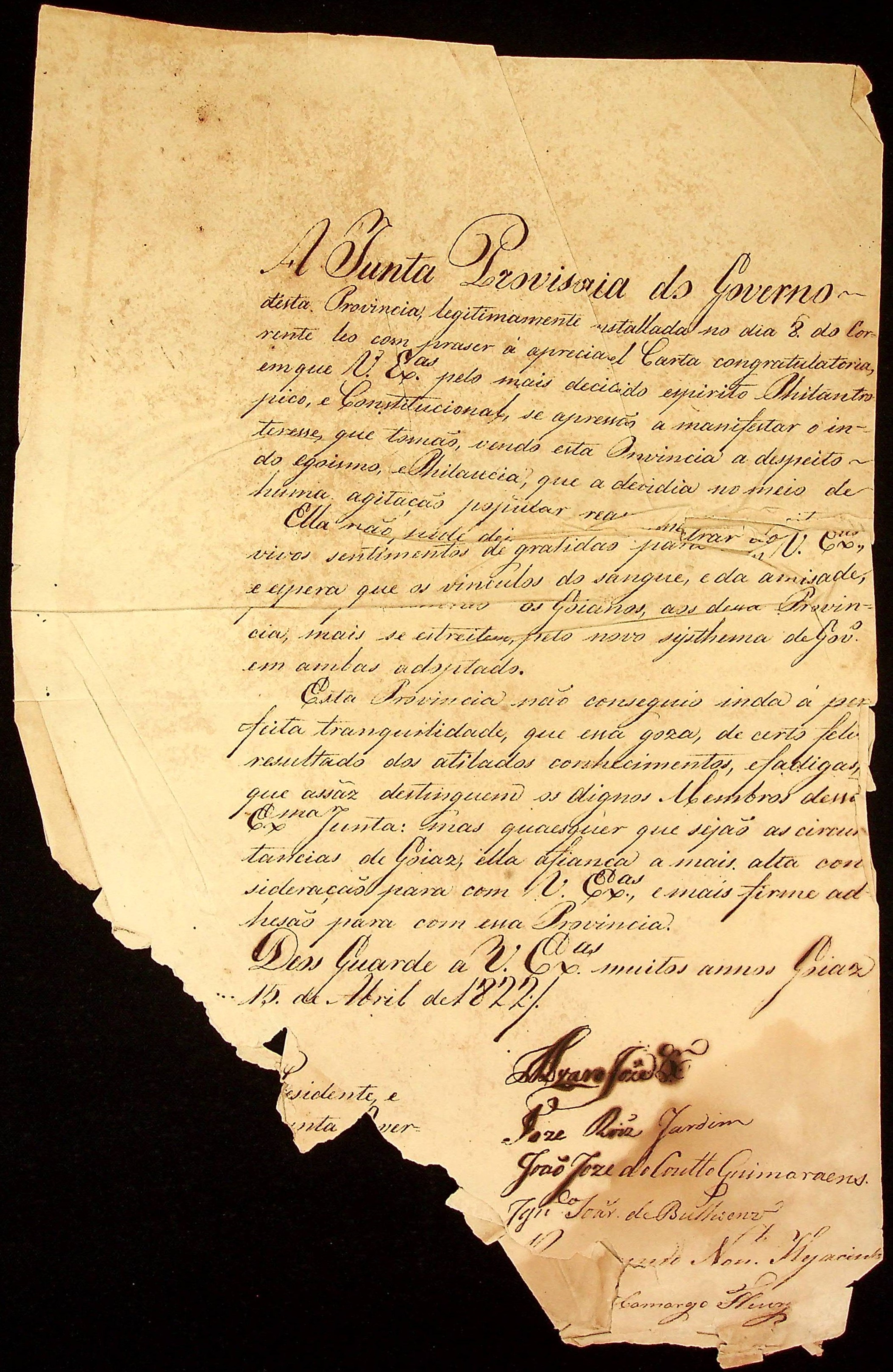 CARTA da Junta Governativa da Província de Goiás à [Junta Governativa Provisória da Província de Mato Grosso].