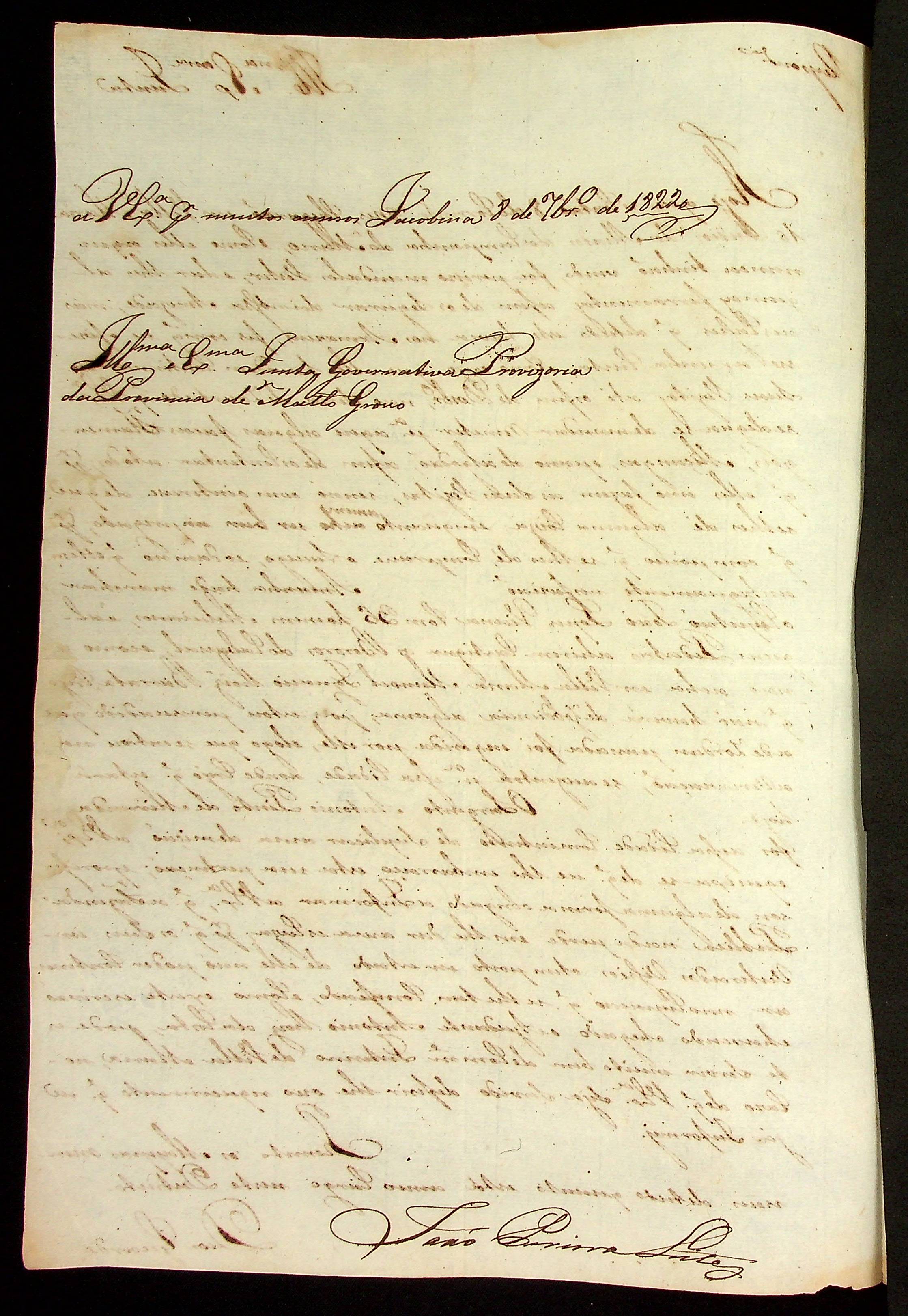 CARTA de João Pereira Leite à [Junta Governativa Provisória da Província de Mato Grosso].