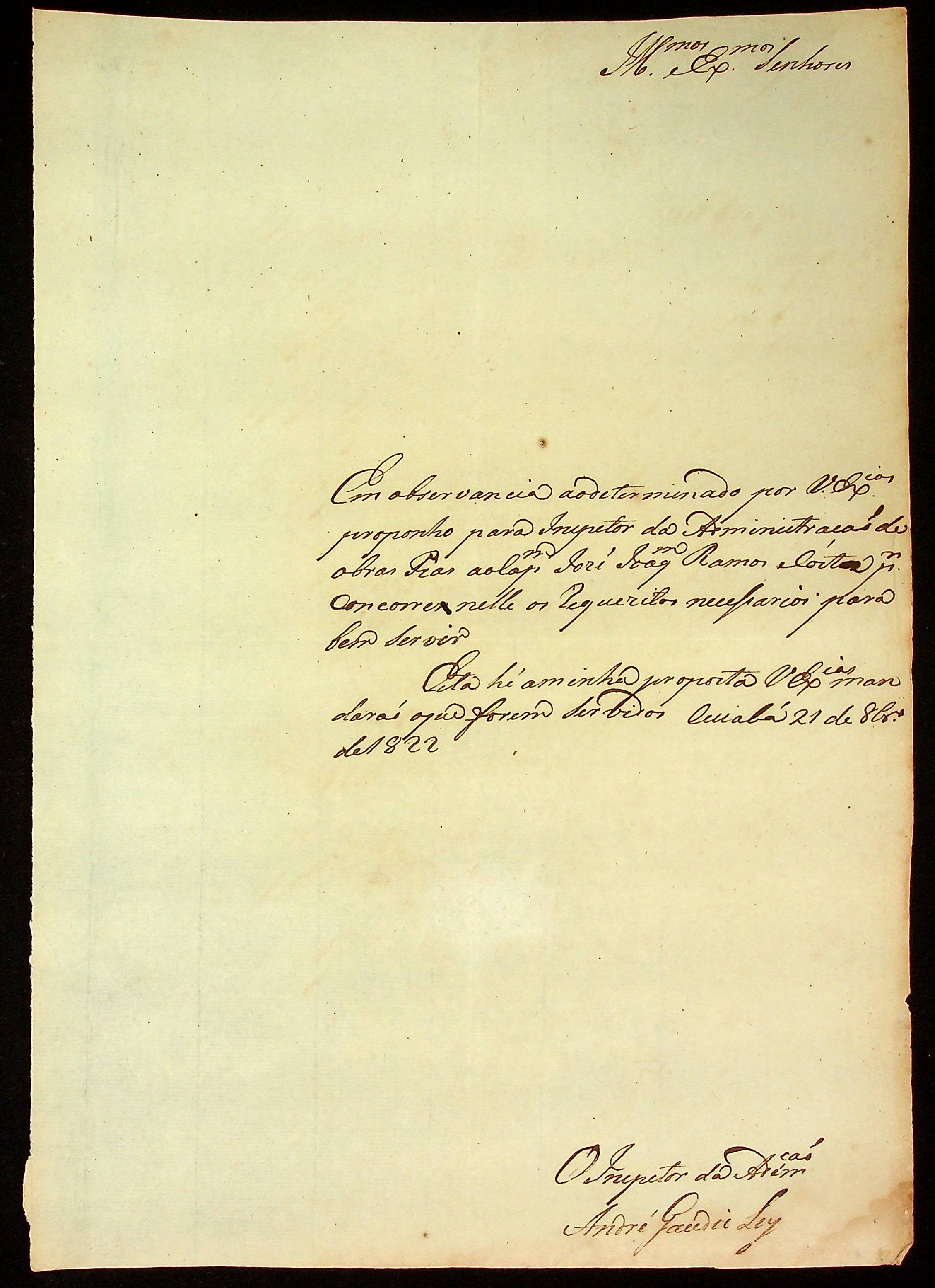 CARTA do Inspetor da Administração André Gaudie Ley à [Junta Governativa Provisória da Província de Mato Grosso].