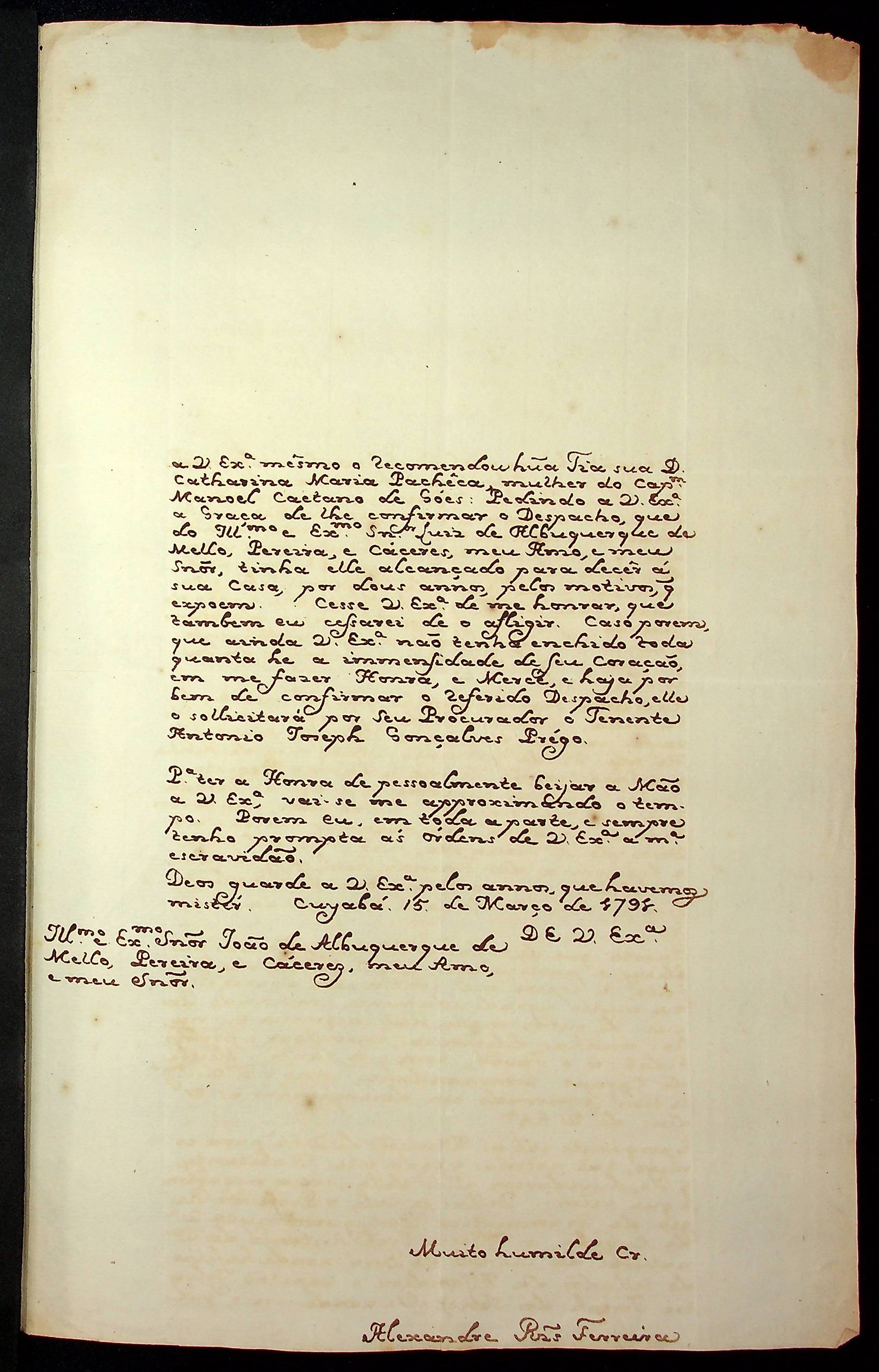 CARTA do Naturalista Alexandre Rodrigues Ferreira ao Governador e Capitão-General da Capitania de Mato Grosso João de Albuquerque de Melo Pereira e Cáceres.