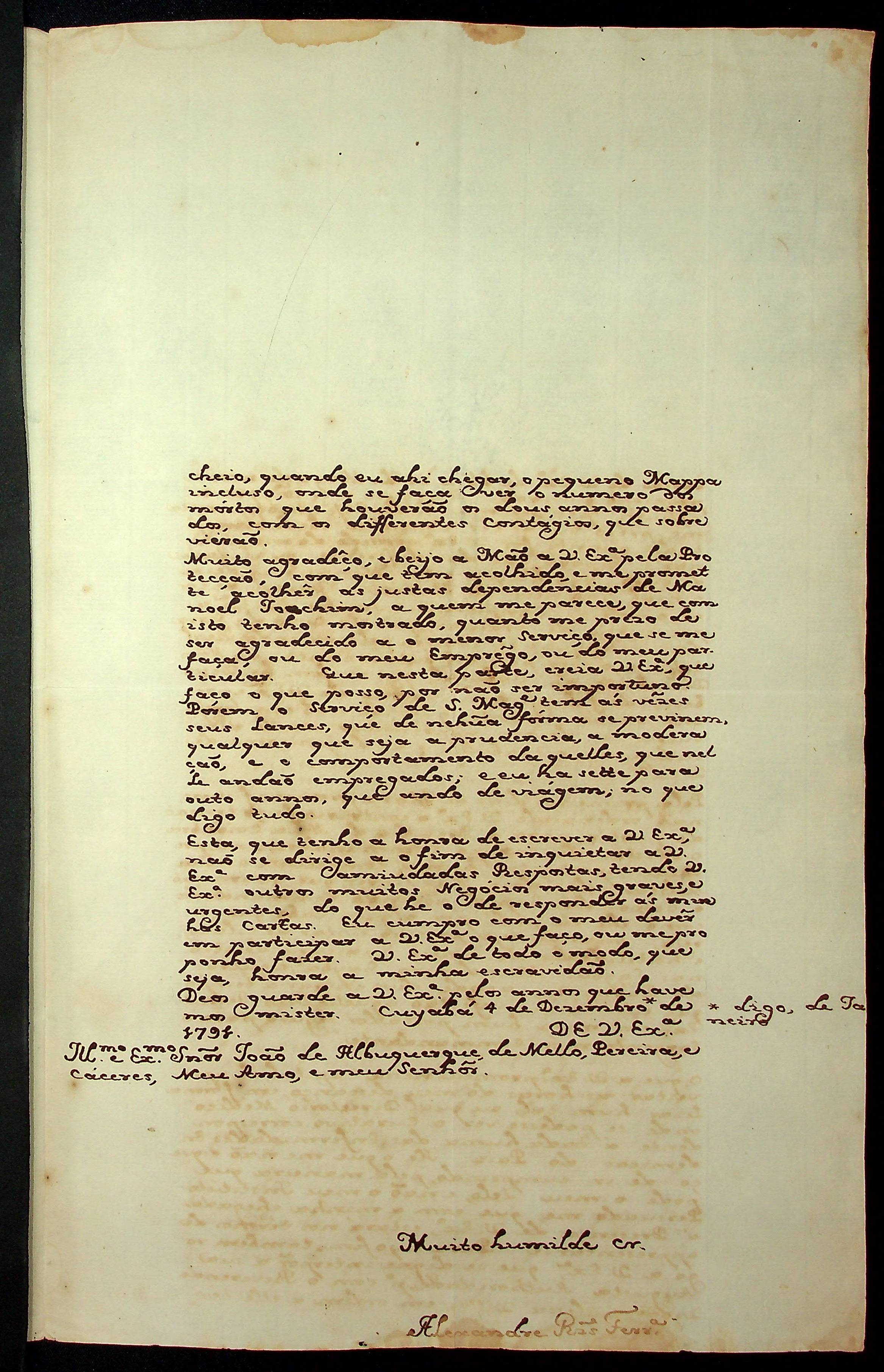 CARTA do Naturalista Alexandre Rodrigues Ferreira ao Governador e Capitão-General da Capitania de Mato Grosso João de Albuquerque de Melo Pereira e Cáceres, expondo questões relativas às suas viagens para o interior da Capitania.