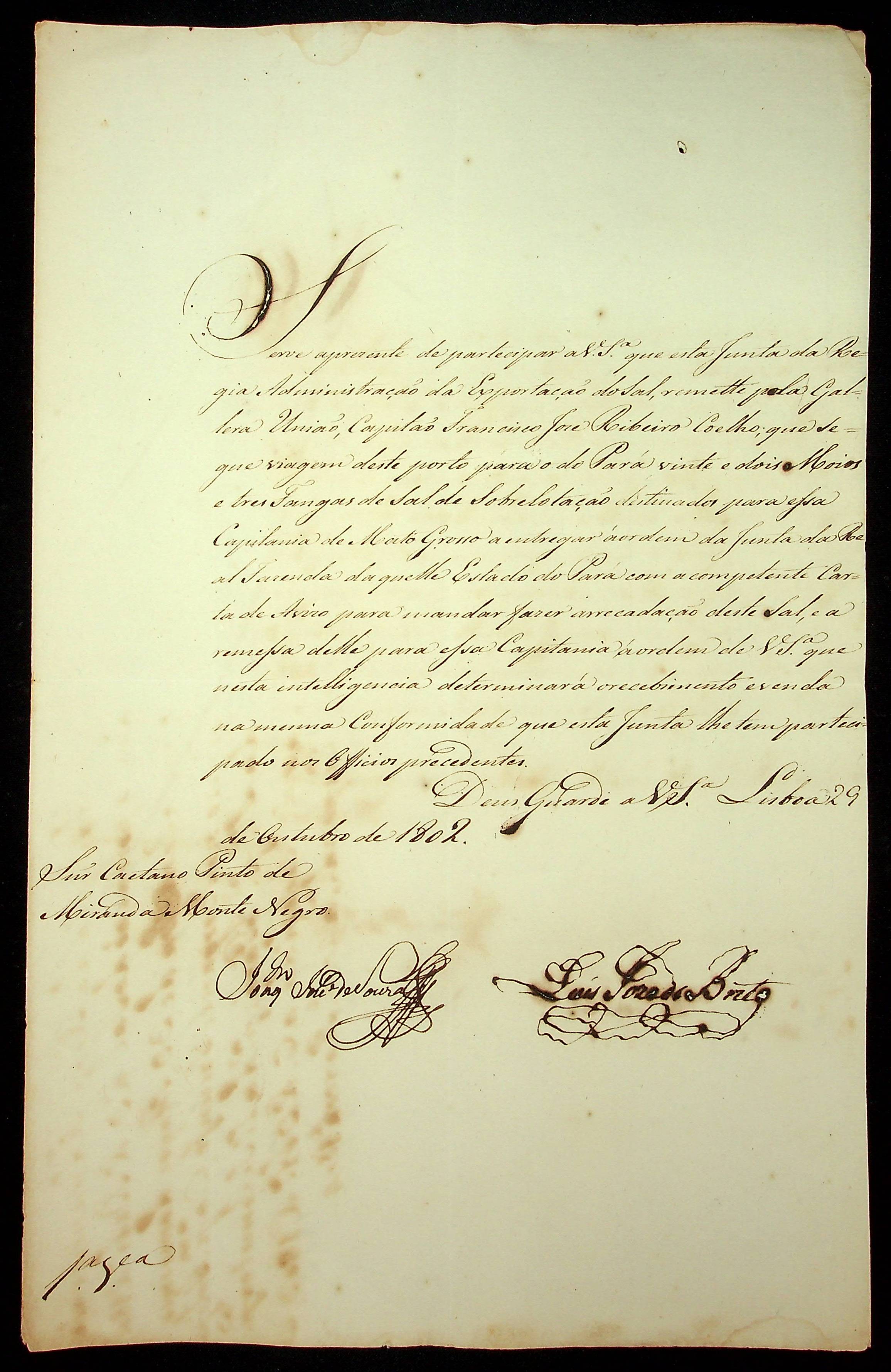 CARTA (conjunto) da Junta da Administração da Exportação do Sal ao Governador e Capitão-General da Capitania de Mato Grosso Caetano Pinto de Miranda e Montenegro.