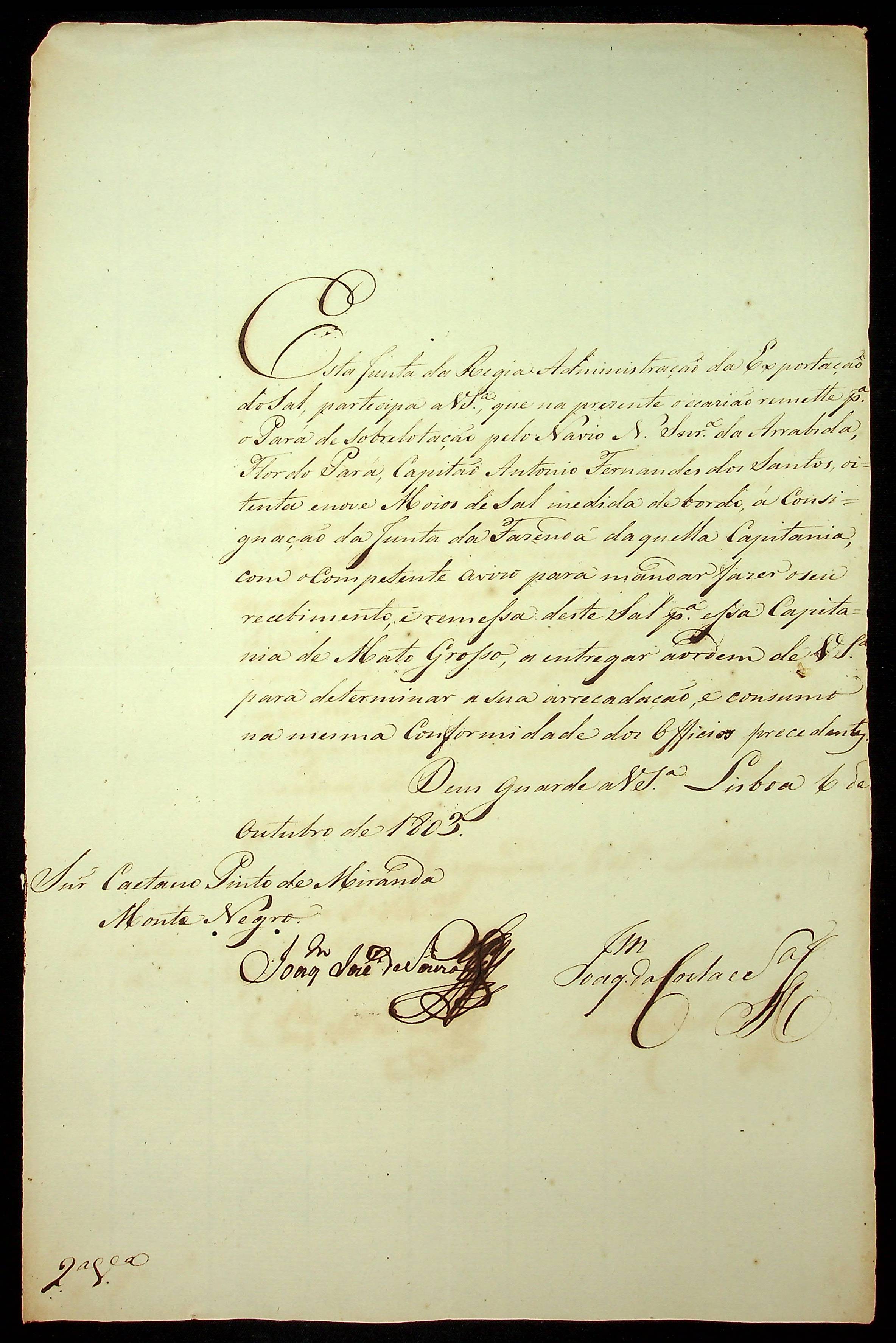 CARTA (Conjunto) de dez cartas da Junta da Administração da Exportação do Sal ao Governador e Capitão-General da Capitania de Mato Grosso Caetano Pinto de Miranda e Montenegro.