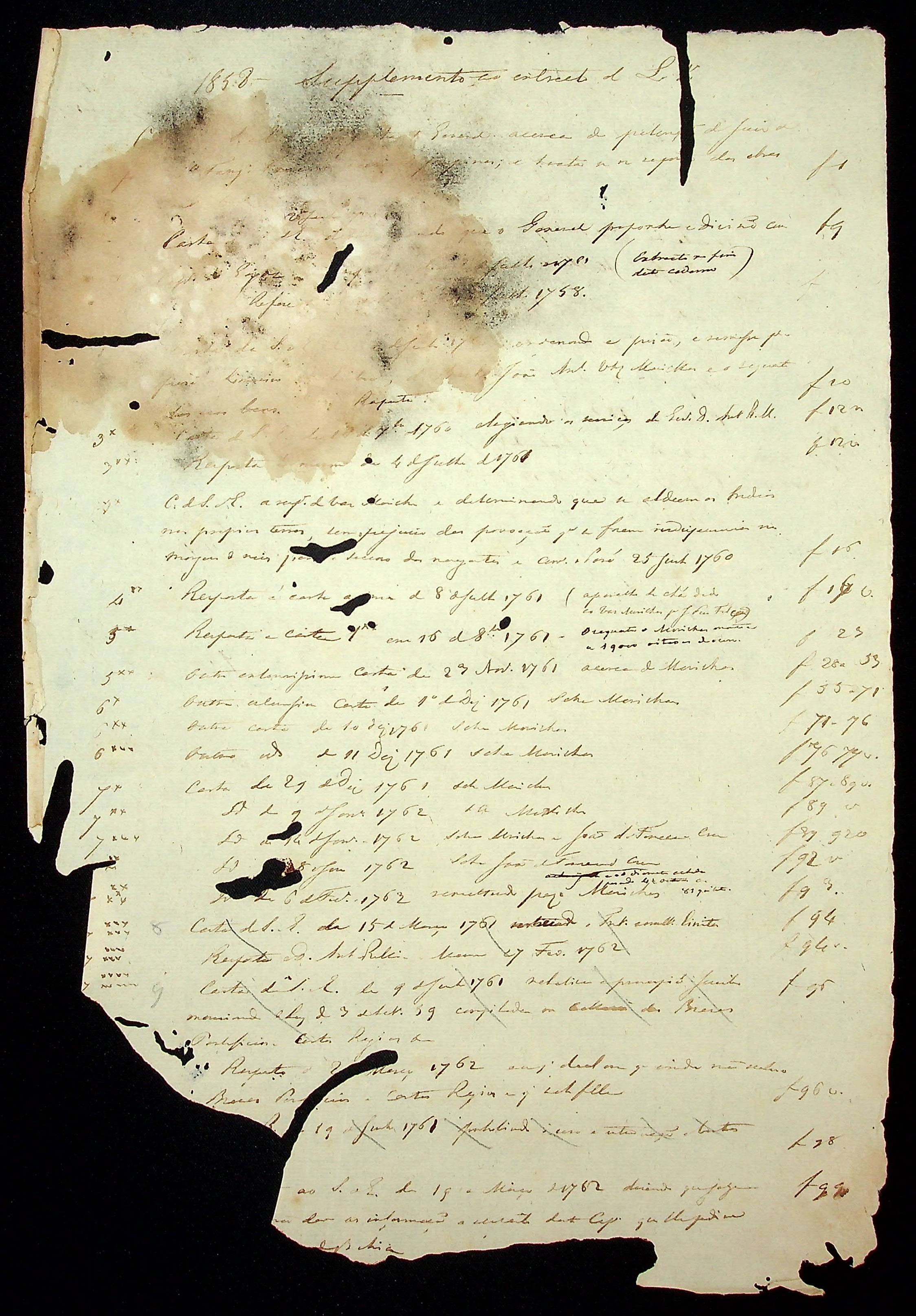 CÓDICES (cópia) apontamento do livro primeiro de correspondência da [Secretaria] de Estado de 1760 - 1768. Contém relação de correspondência e resumo parcial de algumas cartas.