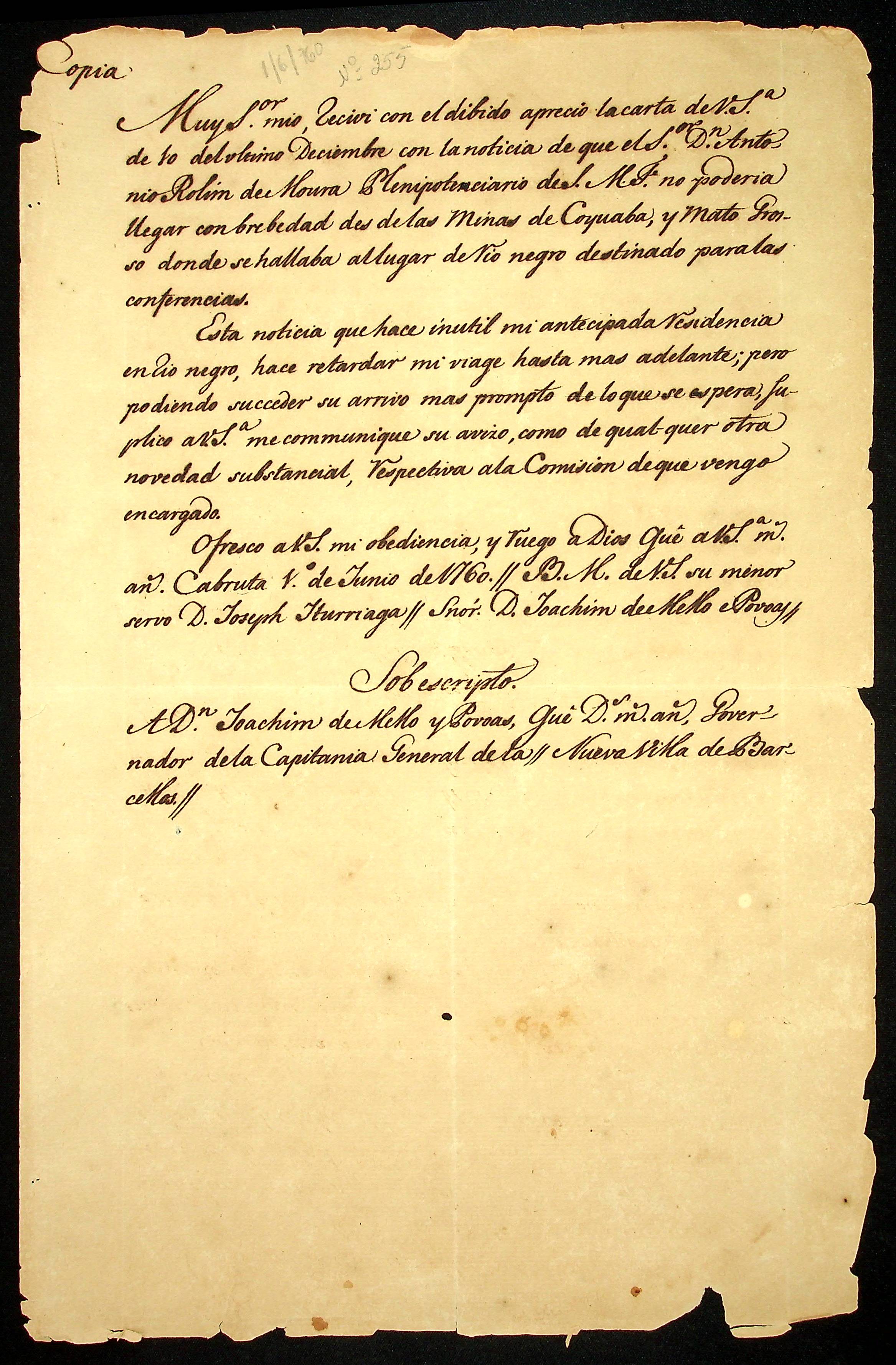 CARTA (cópia) de Joseph de Iturnaga ao Doutor Manuel Bernado de Melo de Castro versando sobre a Demarcação dos Limites.