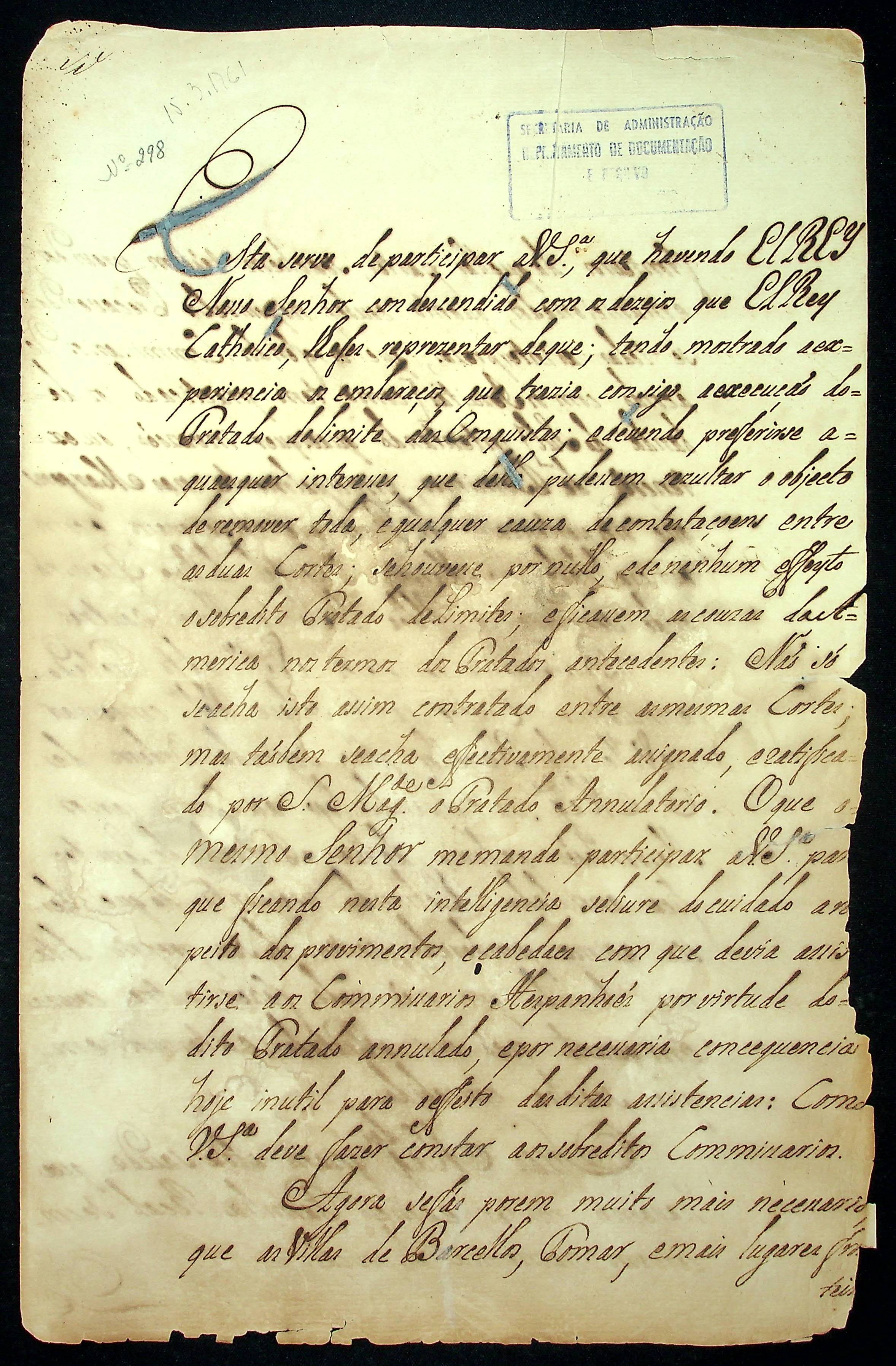 CARTA de Francisco Xavier Mendonça Furtado ao Capitão General Antônio Rolim de Moura informando a Anulação do Tratado de Madri, recomendando o cuidado para com as Vilas de Barcelos, tomar e mais lugares fronteiras, assim como para com os possíveis invasões por meio da margem oriental do Rio Guaporé, onde se acha a aldeia de Santa Rosa.