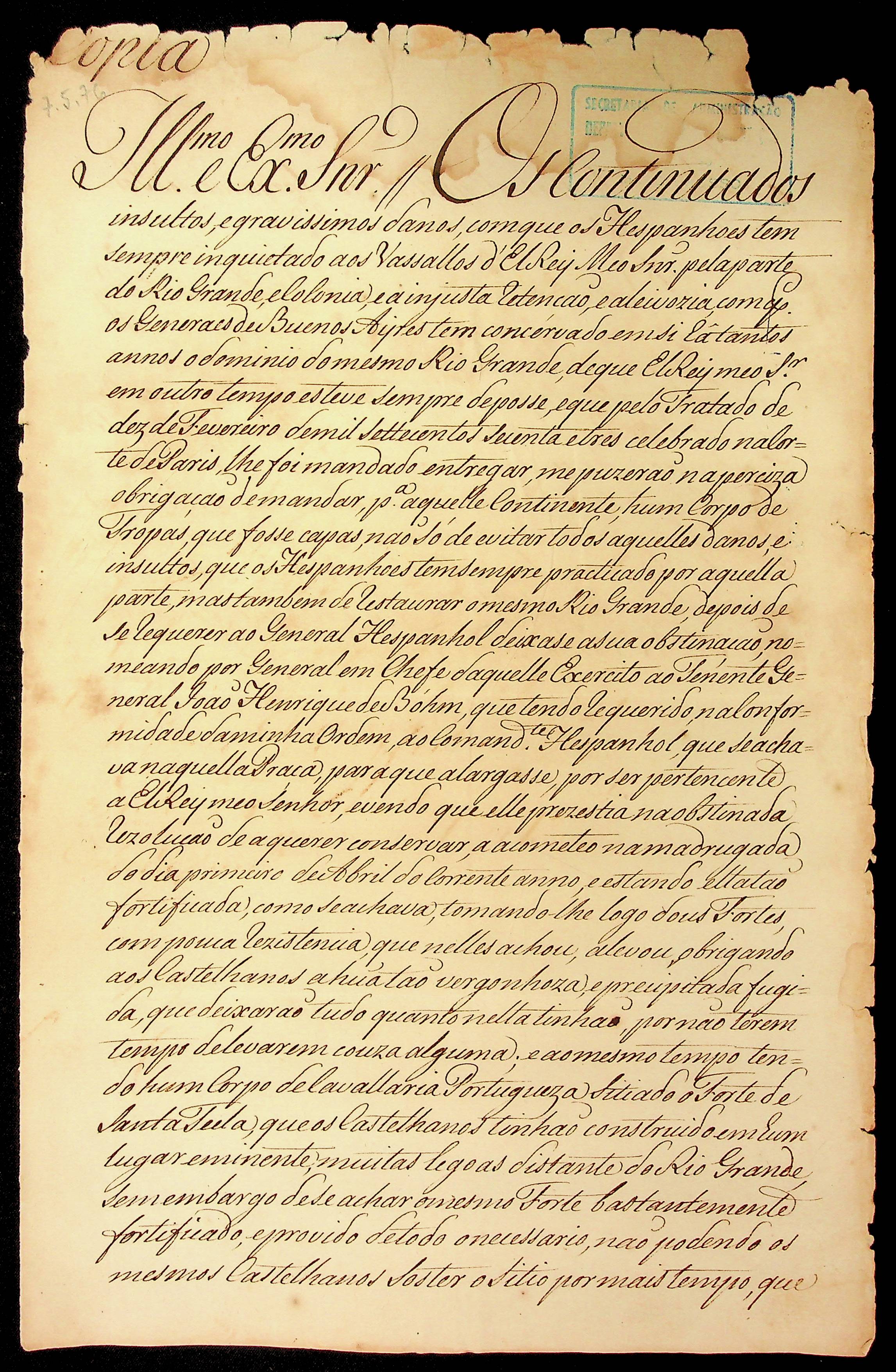 CARTA (cópia) do Marquês do lavradio ao Doutor Antônio de Noronha sobre os insultos realizados pelos Espanhóis pela parte do Rio Grande e Colônia.