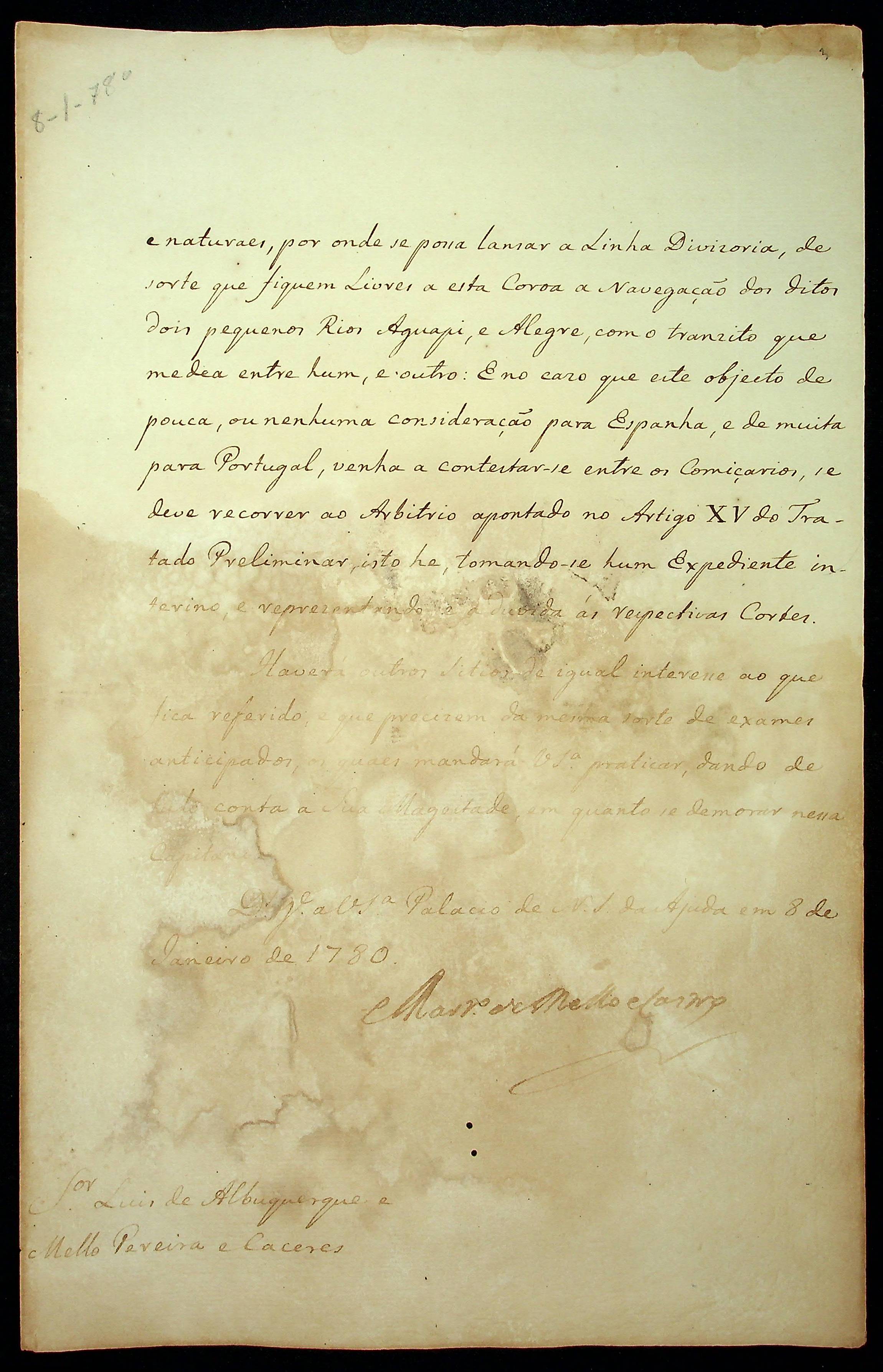 CARTA do Secretário de Estado dos Negócios da Marinha Ultramar Martinho de Melo e Castro ao Governador e Capitão General da Capitania de Mato Grosso Luís de Albuquerque de Melo Perreira e Cáceres, sobre a demarcação de tratado de limites.