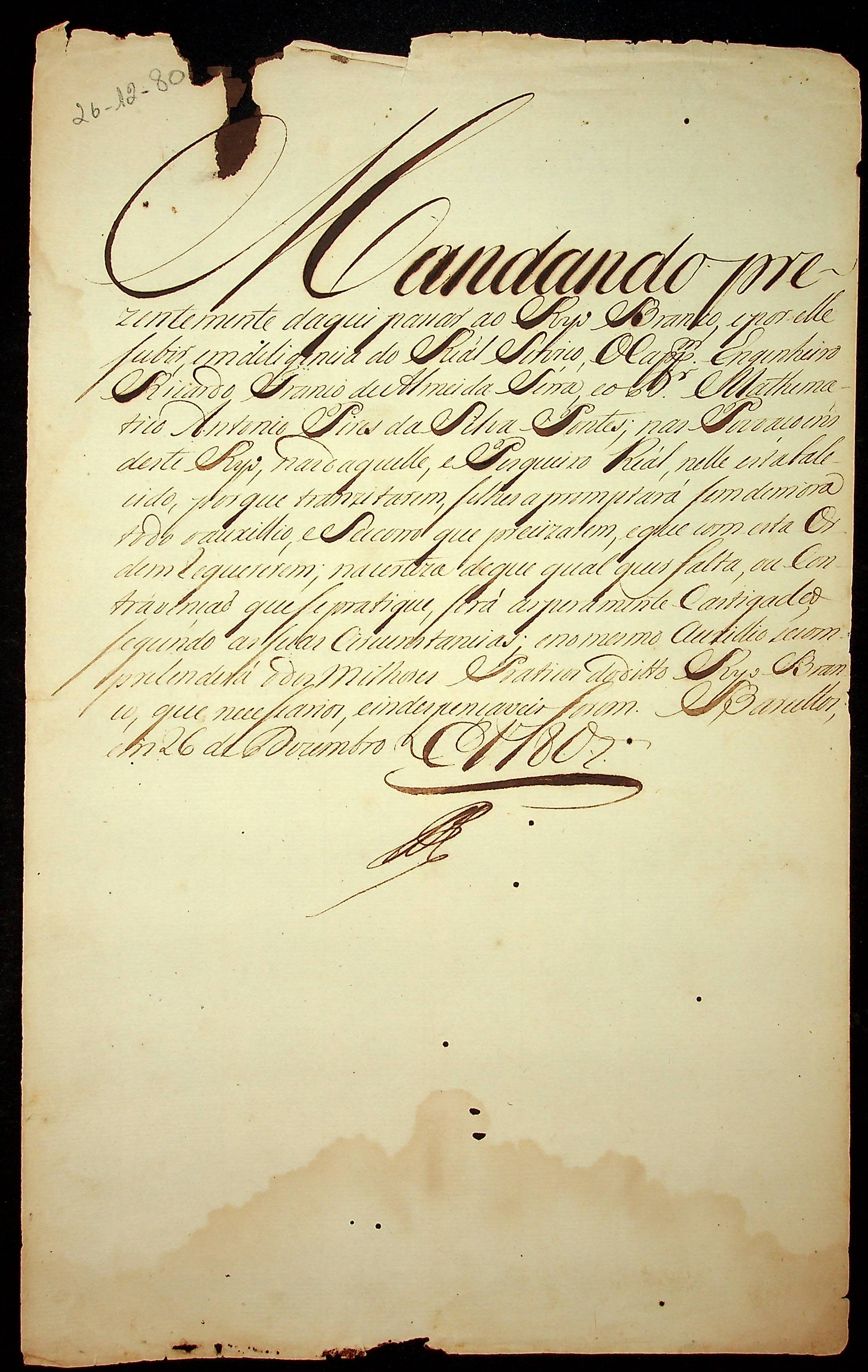 CARTA mandando o Capitão Engenheiro Ricardo Franco de Almeida Serra e o Dr. Matemático Antônio Pires da Silva Pontes passarem as povoações do Rio Branco e pesqueiro Real.