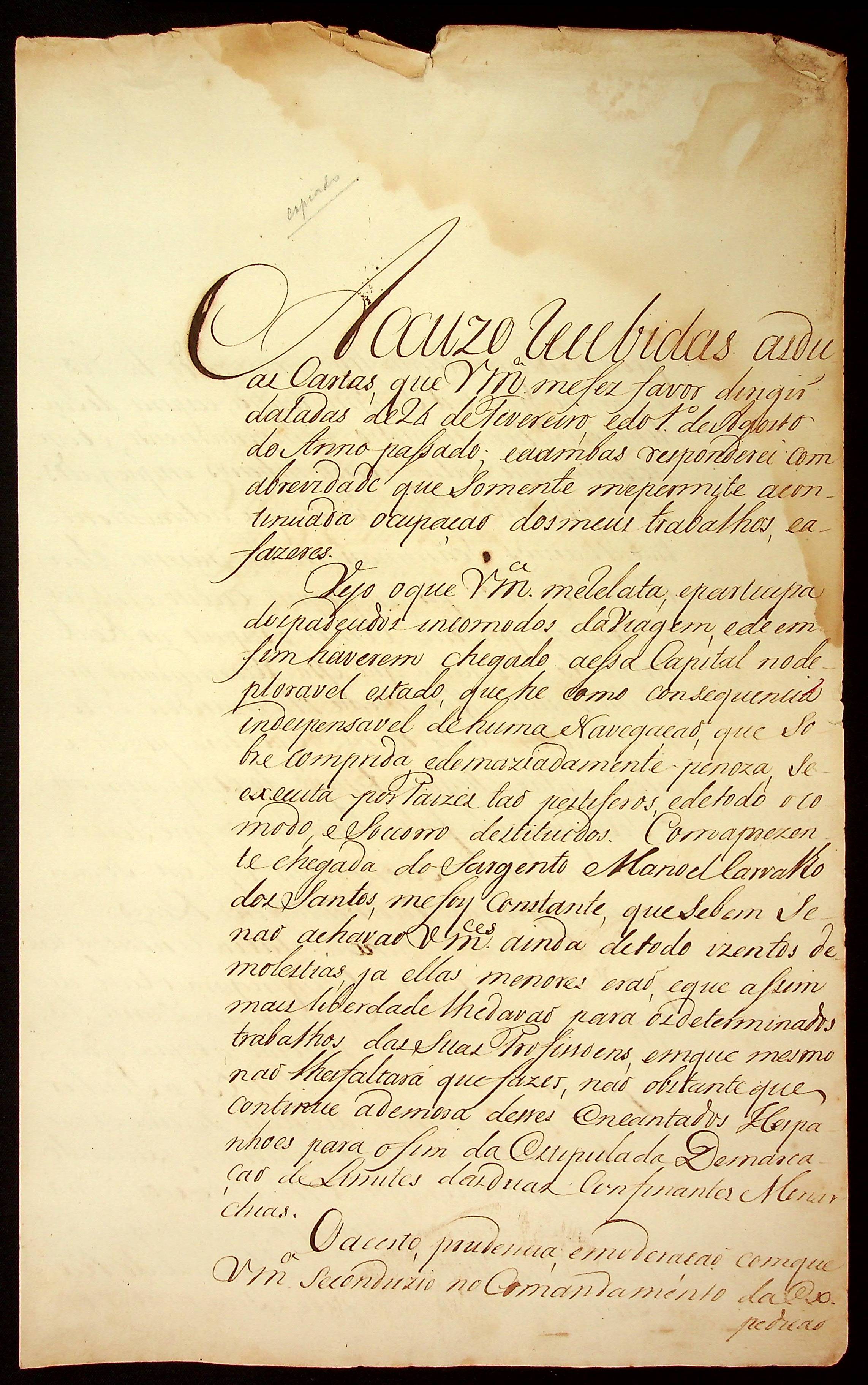 CARTA de João Pereira Caldas ao Capitão Engenheiro Ricardo Franco de Almeida Serra sobre a viagem relativa à demarcação de limites.
