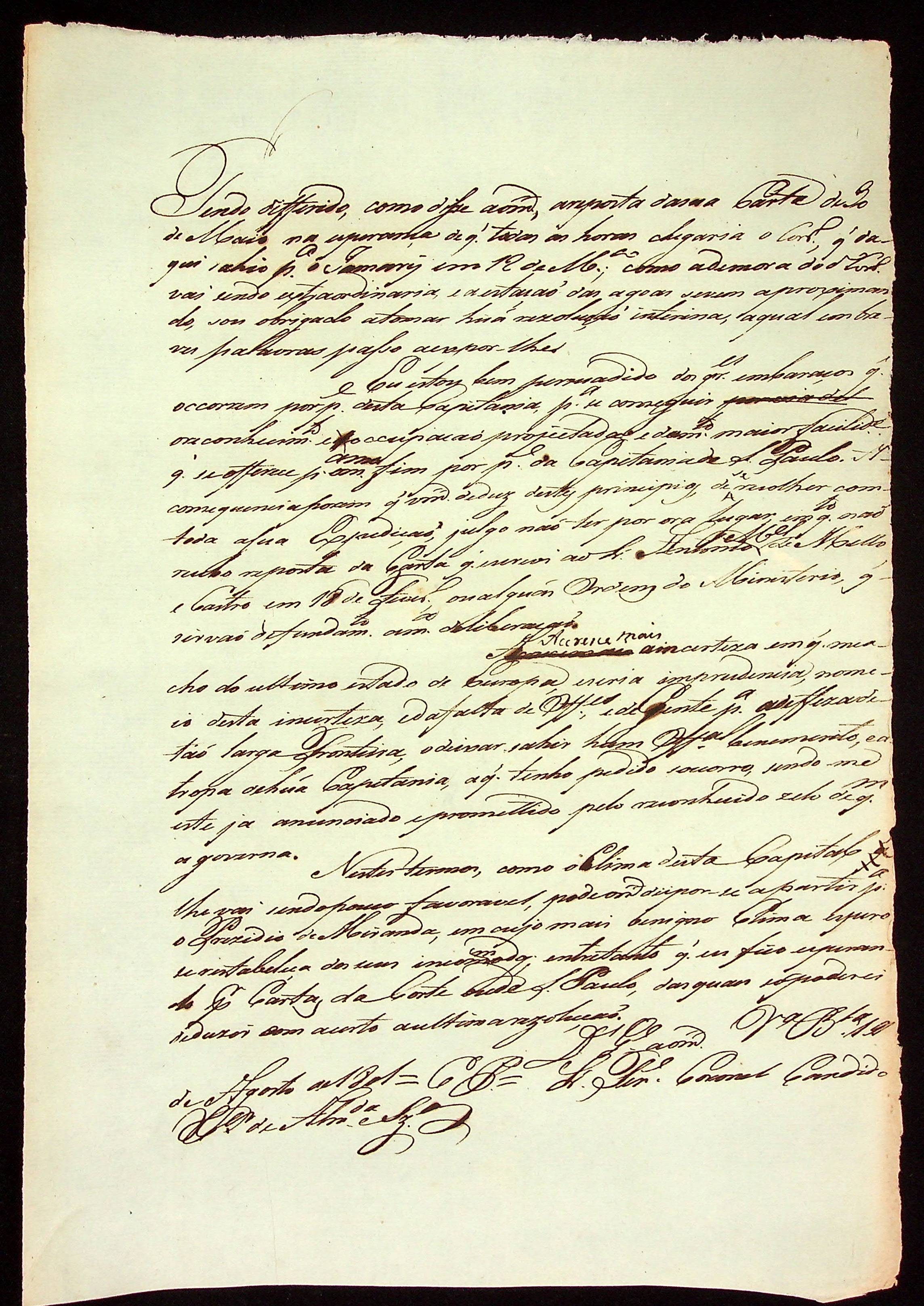 CARTA do Tenente Coronel e comissário Cândido Xavier de Almeida Souza versando sobre as dificuldades Enfrentadas na Capitania em função do clima, além da falta de pessoas para realizar o trabalho.