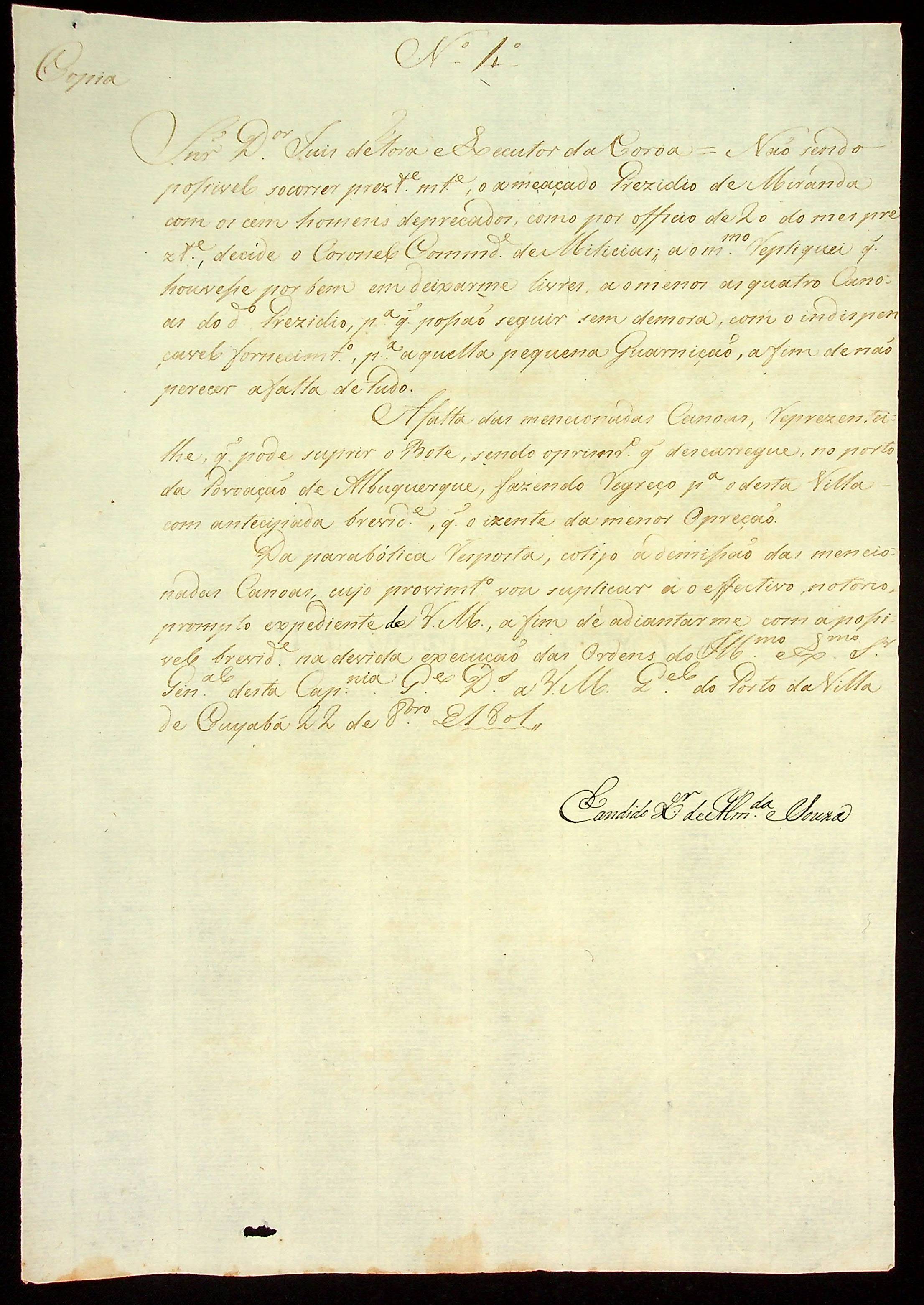 CARTA (Cópia) do Tenente Coronel e comissário Cândido Xavier de Almeida Souza ao Juíz de Fora e executor da coroa [Joaquim Inácio Ribeiro da Mota].
