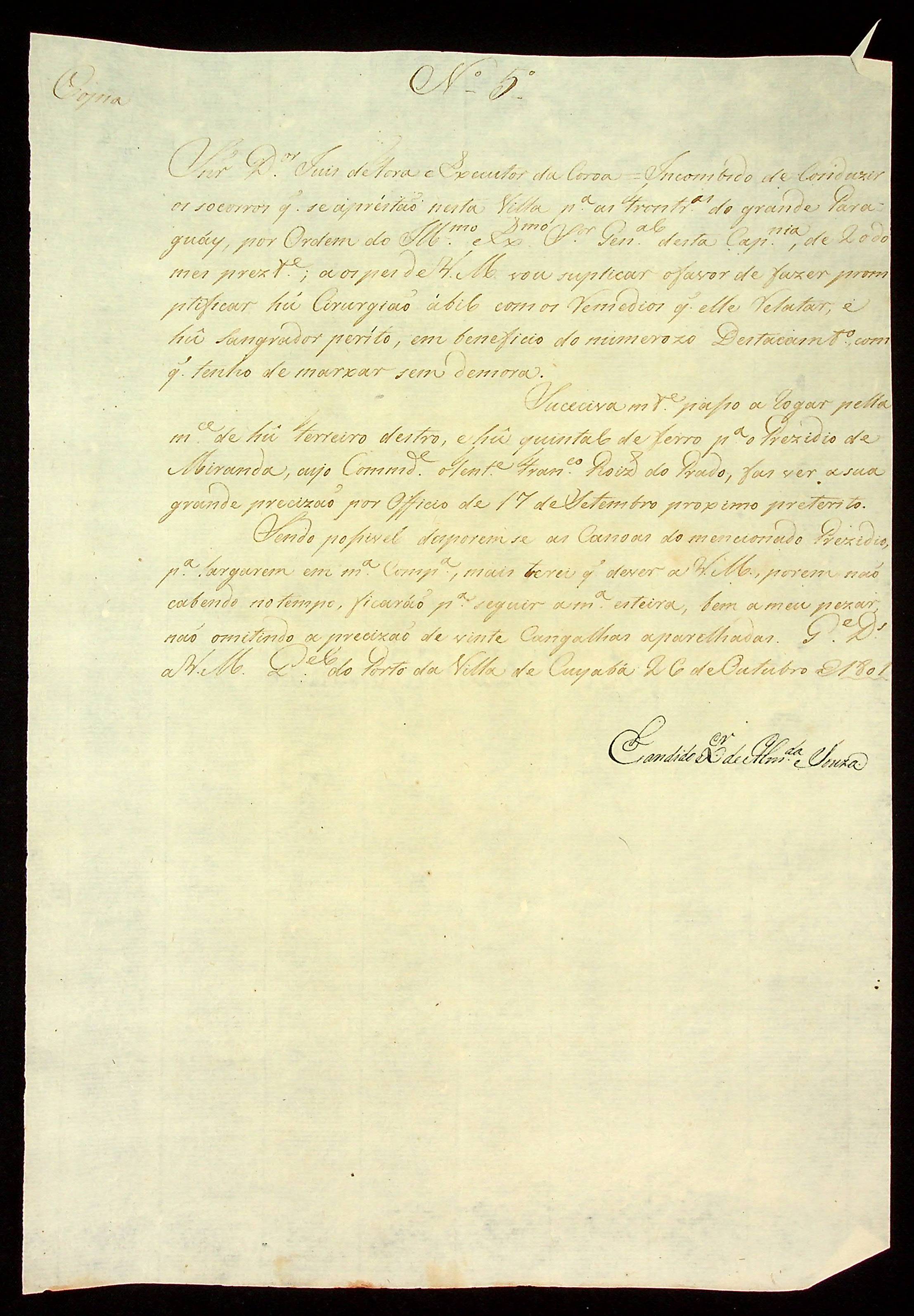 CARTA do Tenente Coronel e comissário Cândido Xavier de Almeida Souza ao Juíz de Fora e executor da coroa [Joaquim Inácio Ribeiro da Mota]