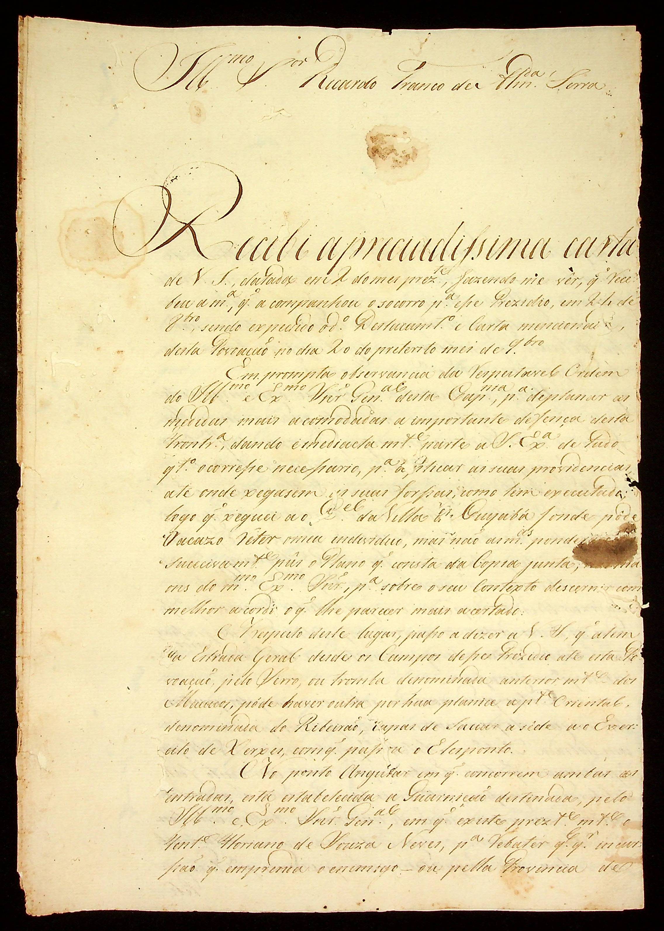 CARTA do Tenente Coronel e comissário Cândido Xavier de Almeida Souza ao Tenente Coronel e Comandante da Fronteira Ricardo Franco de Almeida Serra.