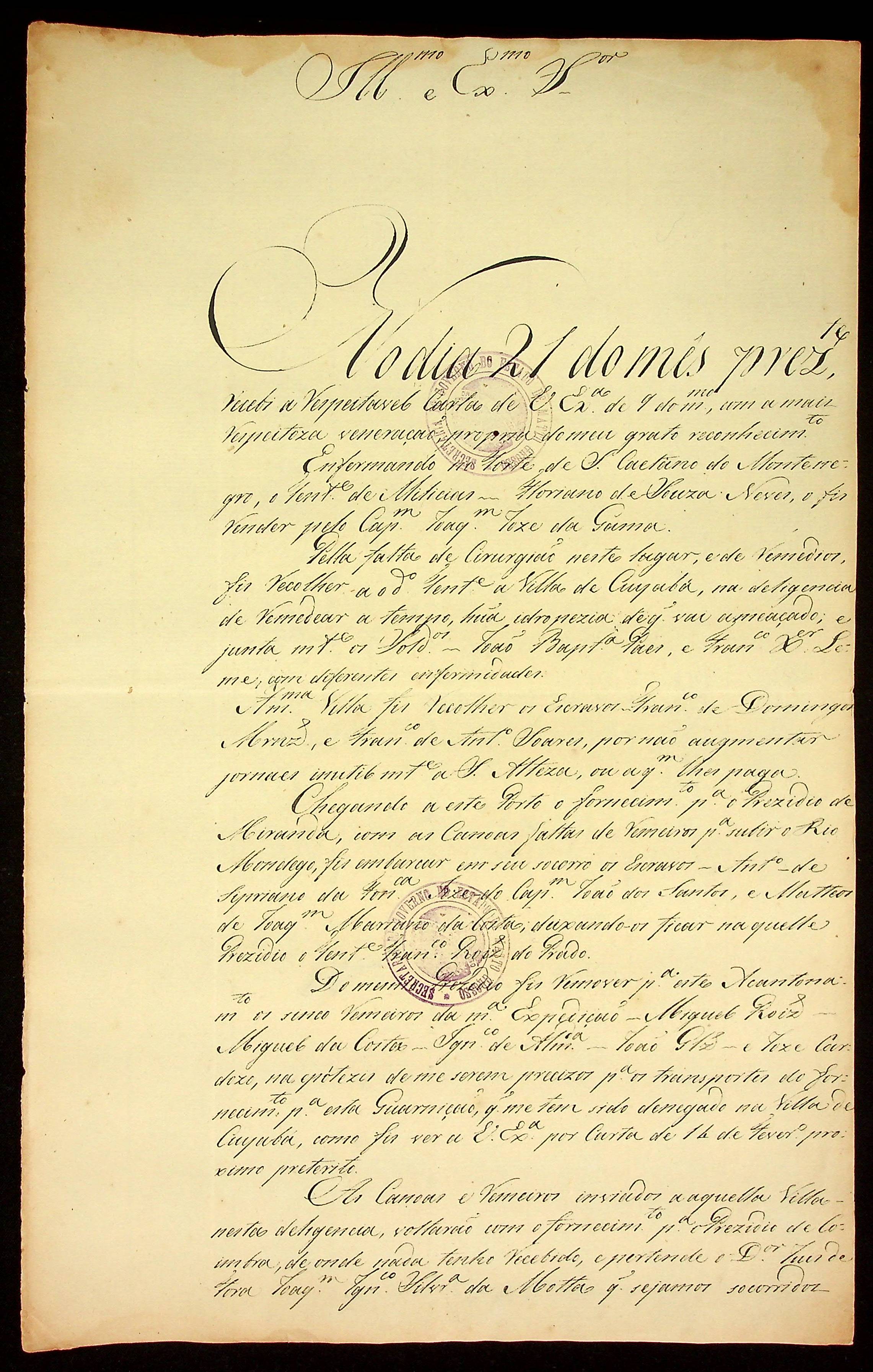 CARTA do Tenente Coronel Comissário Candido Xavier de Almeida Souza para o Governador e Capitão General da Capitania de Mato Grosso Caetano Pinto de Miranda e Montenegro.