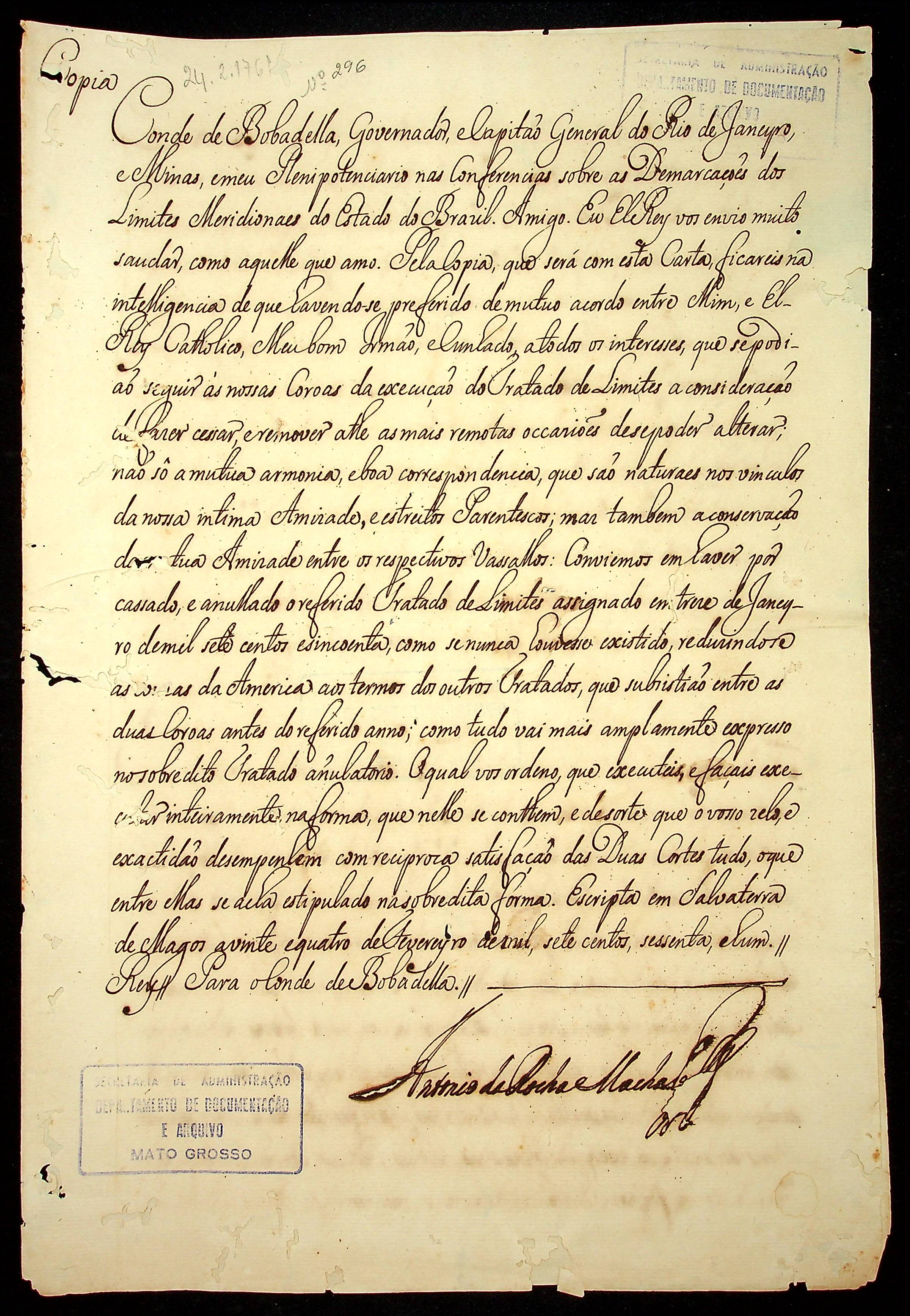 CARTA RÉGIA (cópia) ao Governador e Capitão General do Rio de Janeiro e Minas informando a anulação do Tratado de Limites assinado em 13/01/1750.