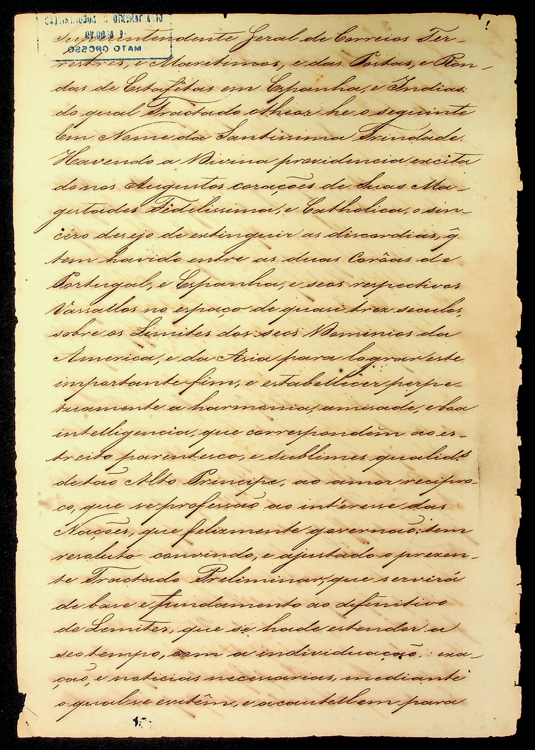 TRATADO (cópia) do Segundo tratado preliminar de Limites celebrado em Santo Idelfonso, em 01 de outubro de 1777 de que fez menção a carta da Secretaria de Estado antecedente.