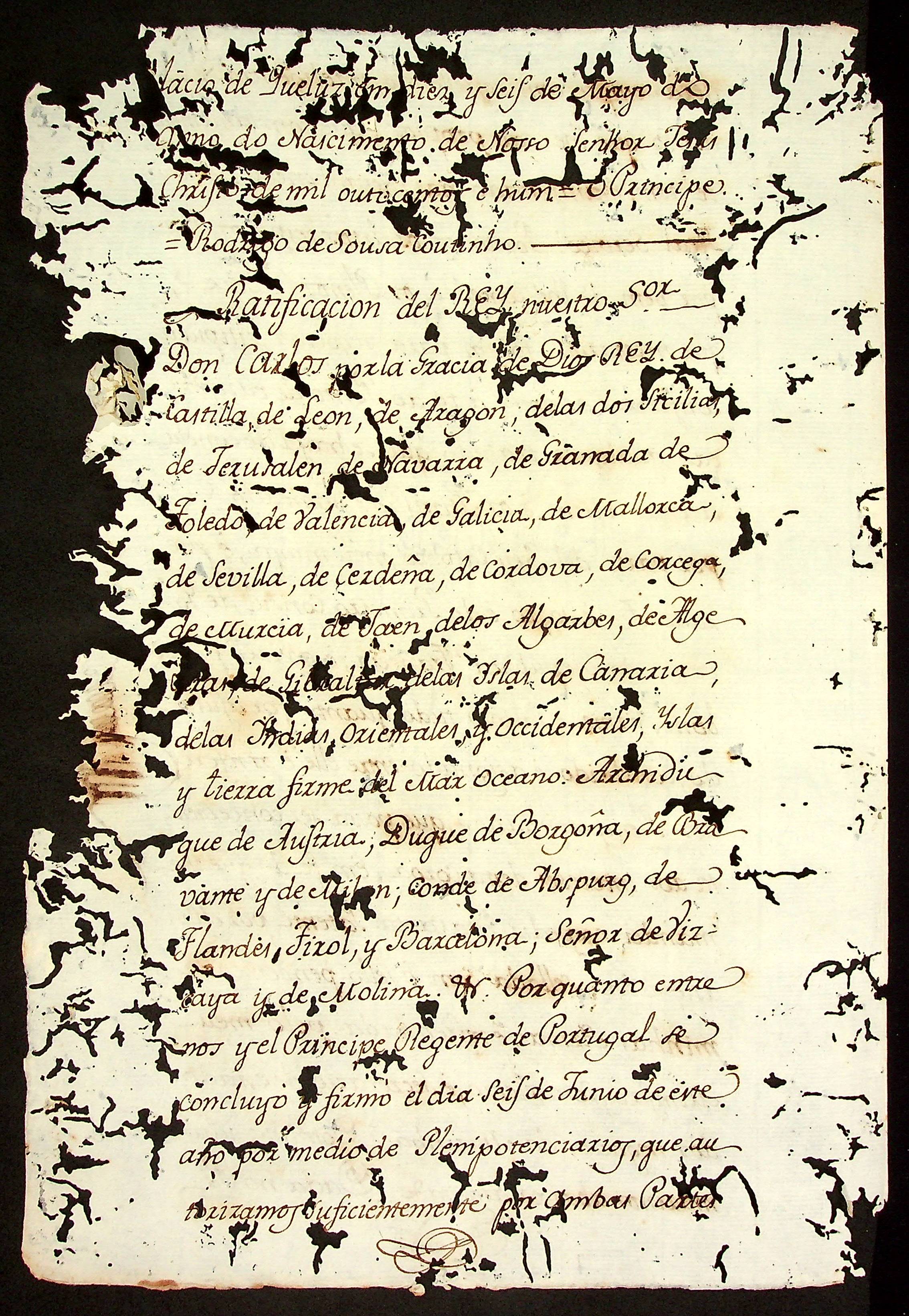 TRATADO assinado entre o Rei da Espanha D. Carlos IV e o Príncipe Regente de Portugal D. João.