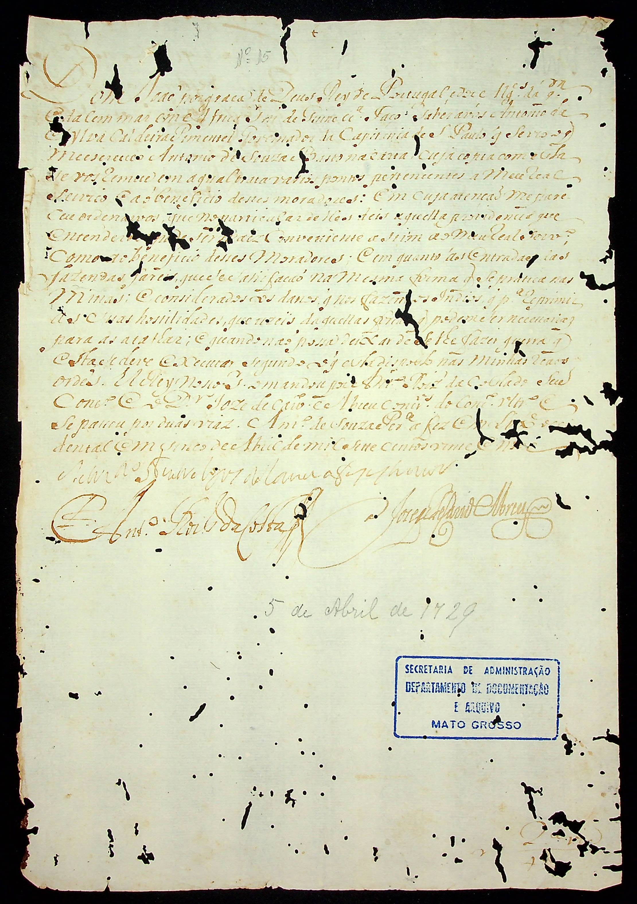CARTA RÉGIA do Rei de Portugal Dom João, enviada ao Governador e Capitão-General de São Paulo Antônio da Silva Caldeira Pimentel.