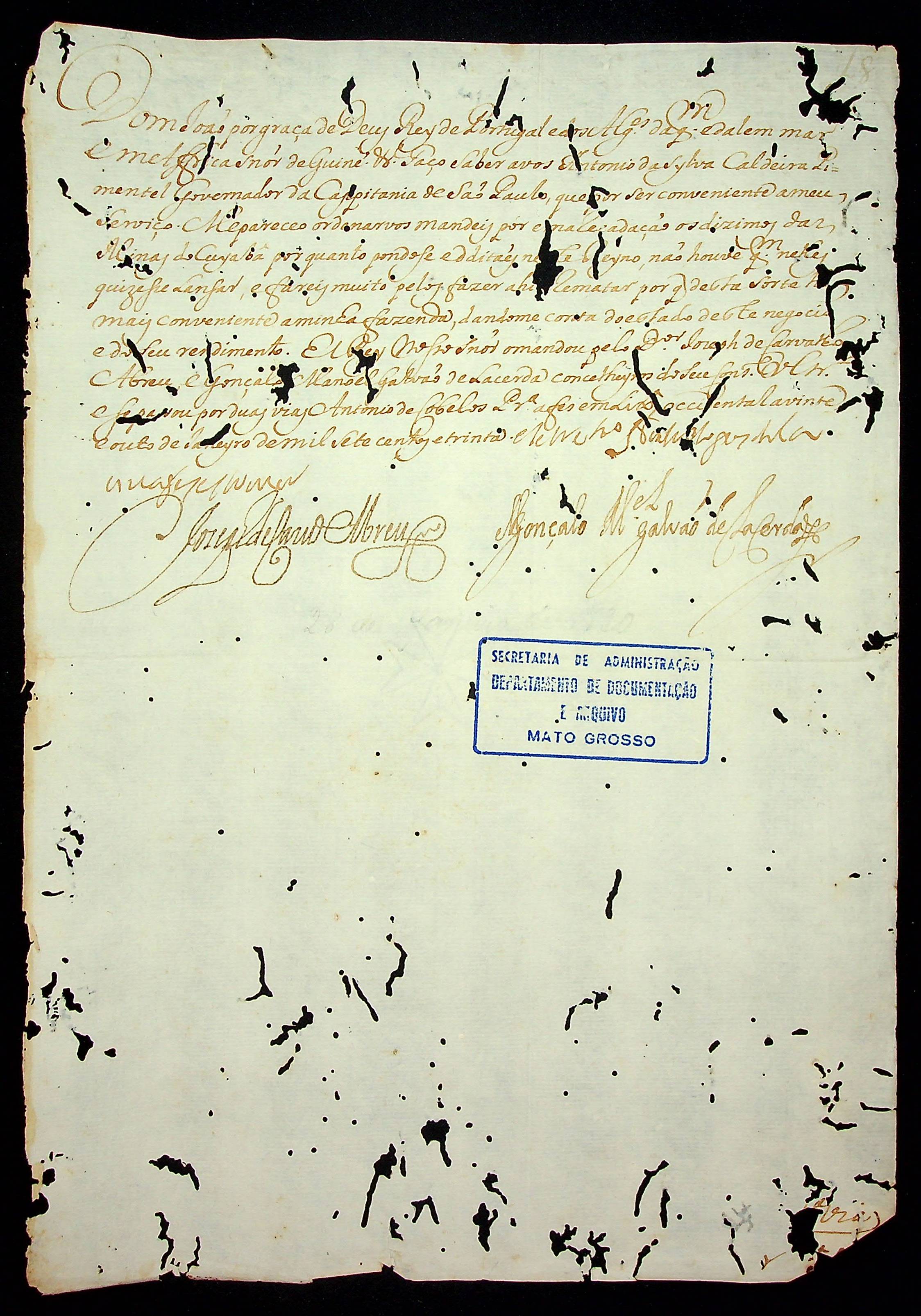 CARTA RÉGIA do Rei de Portugal Dom João, enviada ao Governador e Capitão-General de São Paulo Antônio da Silva Caldeira Pimentel.