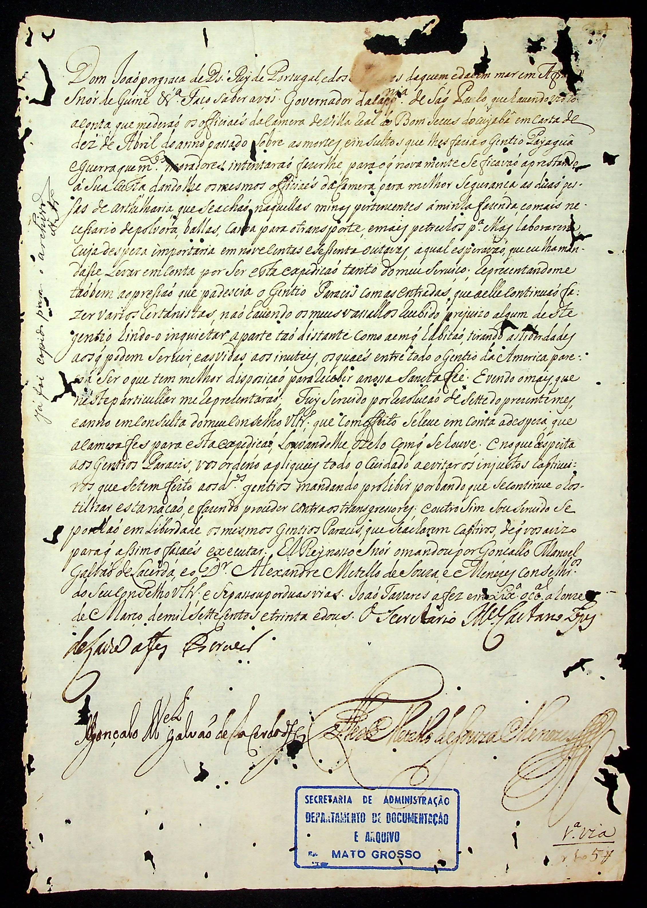 CARTA RÉGIA do Rei de Portugal Dom João, ao Governador e Capitão-General de São Paulo Antônio da Silva Caldeira Pimentel.