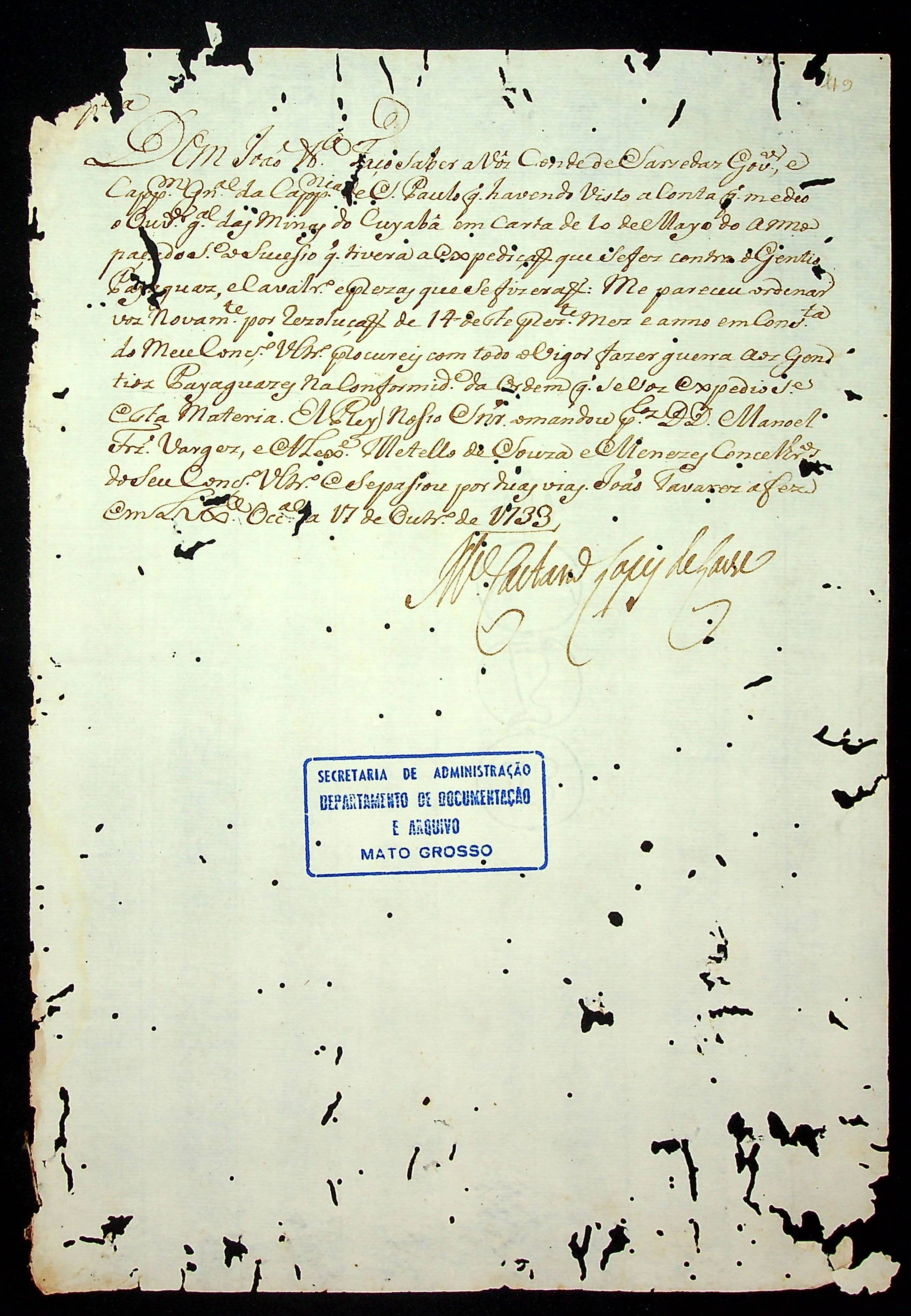 CARTA RÉGIA do Rei de Portugal Dom João ao Governador e Capitão-General da Capitania de São Paulo, sobre o sucesso da guerra contra o gentio Paiaguás e Cavaleiro.