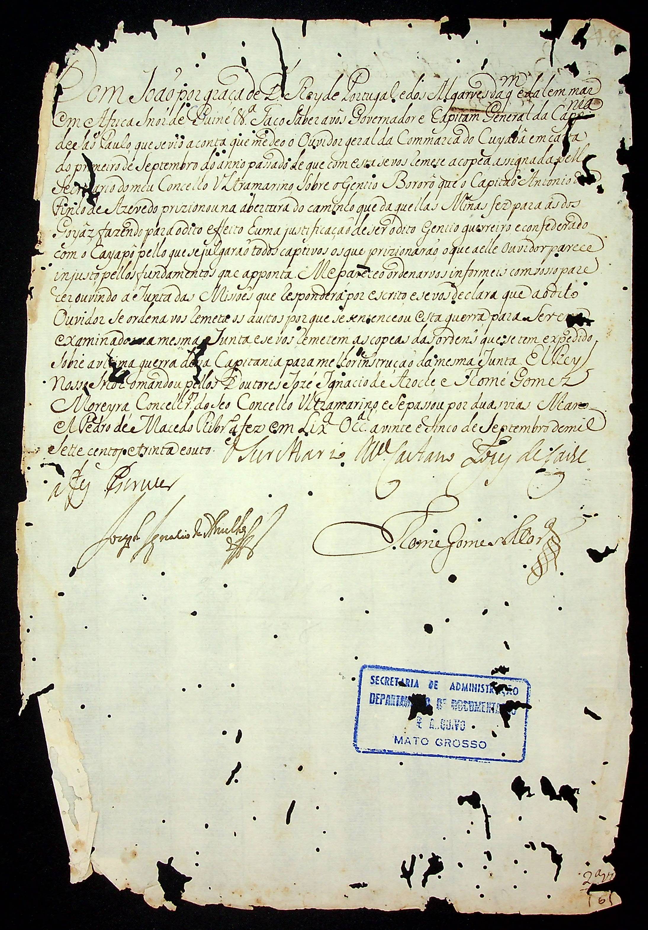 CARTA RÉGIA do Rei de Portugal Dom João ao Governador e Capitão-General da Capitania de São Paulo [Gomes Freire de Andrade].