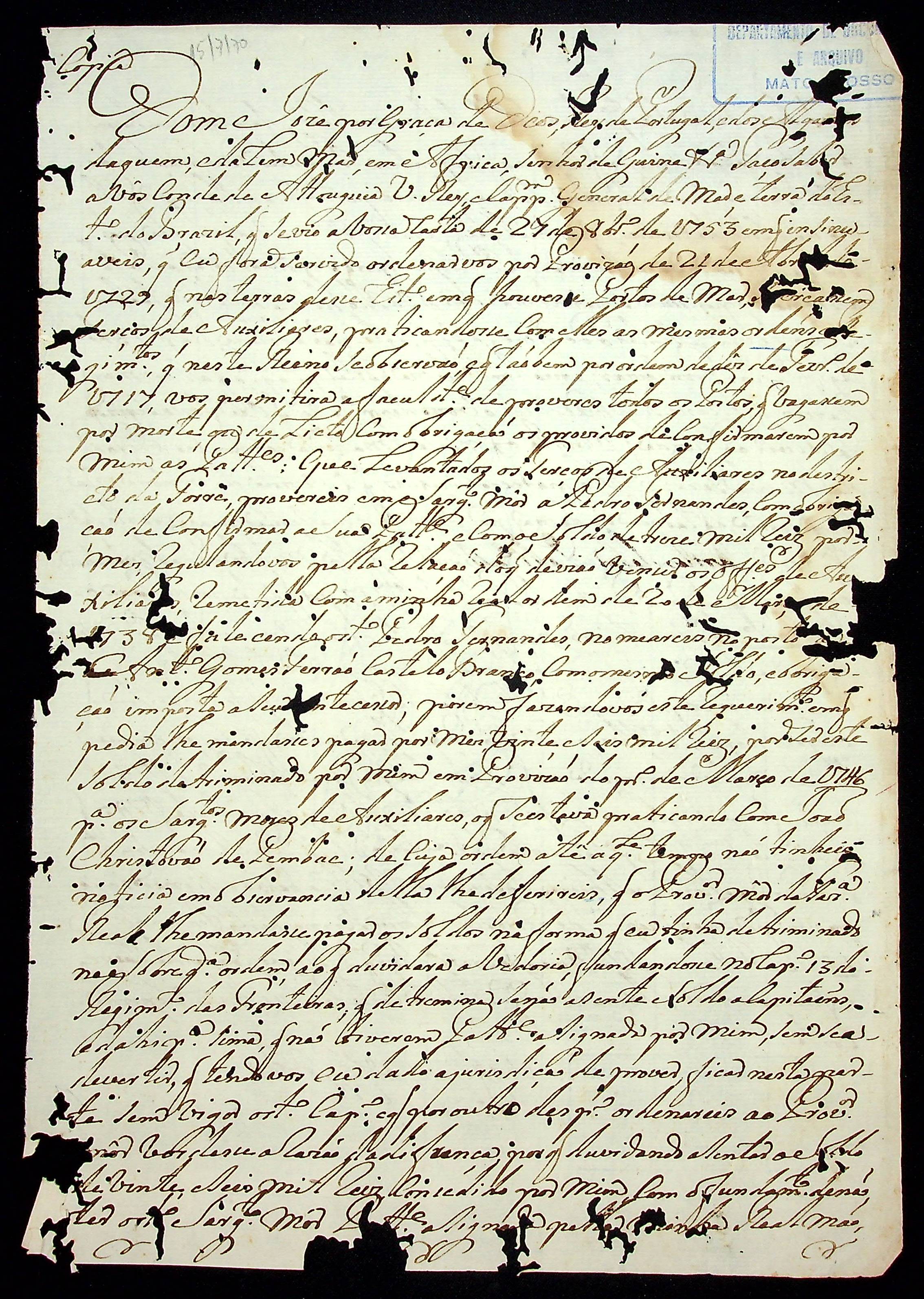 CARTA RÉGIA (Cópia) do Rei Dom José ao Vice Rei e Capitão-General de Mar e Terra do Estado do Brasil, o Conde de Attougia.