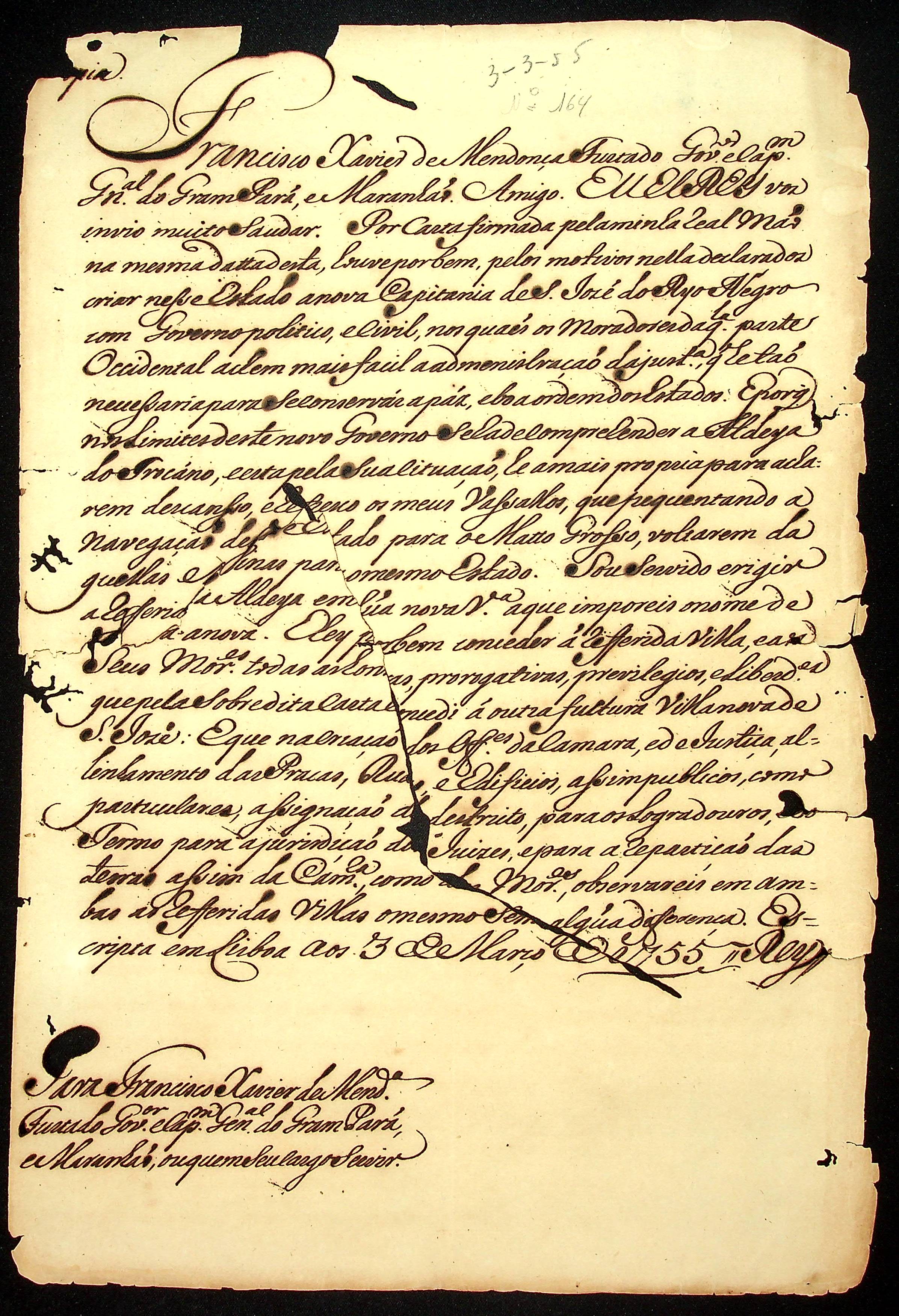 CARTA RÉGIA (cópia) do Rei Dom José ao Governador e Capitão-General da Capitania do Grão-Pará e Maranhão Francisco Xavier de Mendonça Furtado.